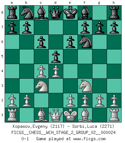 Last move : 0-1 2022 April 11 7:53:34 [Event "FICGS__CHESS__WCH_STAGE_2_GROUP_02__000024"] [Site "FICGS"] [Date "2022.03.05"] [Round "1"] [White "Kopasov,Evgeny"] [Black "Sorbi,Luca"] [Result "0-1"] [WhiteElo "2117"] [BlackElo "2271"] 1.d4 Nf6 2.c4 e6 3.Nf3 d5 4.Nc3 c6 0-1 This chess game has been lost on time (started : 2022.03.05 0:42:35) Queen's pawn game Player Black won this chess game. Follow this game move after move (download)You must take your opponent into a deep dark forest where 2+2=5, and the path leading out is only wide enough for one. (Mikhail Tal) Wer nie einen Fehler gemacht hat, hat nie etwas Neues ausprobiert. (Albert Einstein) En partidas rápidas, el Caballo es mas poderoso que el Alfil. (Vlastimil Hort) Il n'y a pas de prix trop élevé au scalp de l'ennemi. (Koblentz) The difference between perseverance and obstinacy is that one comes from a strong will, and the other from a strong won't. (Henry Ward Beecher)