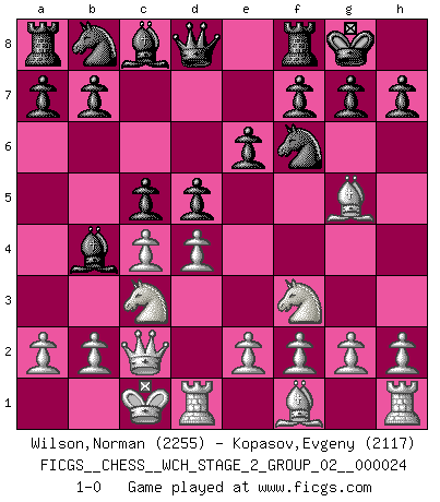 Last move : 1-0 2022 April 12 23:49:6 [Event "FICGS__CHESS__WCH_STAGE_2_GROUP_02__000024"] [Site "FICGS"] [Date "2022.03.05"] [Round "1"] [White "Wilson,Norman"] [Black "Kopasov,Evgeny"] [Result "1-0"] [WhiteElo "2255"] [BlackElo "2117"] 1.c4 Nf6 2.Nc3 e6 3.d4 Bb4 4.Qc2 O-O 5.Nf3 d5 6.Bg5 c5 7.O-O-O 1-0 This chess game has been lost on time (started : 2022.03.05 0:42:35) English Opening Kingside Castling by player Black (move 4) Queenside Castling by player White (move 7) Player White won this chess game. Follow this game move after move (download)Chess opens and enriches your mind. (Saudin Robovic) Wenn es im Universum noch irgendwo intelligente Lebewesen gibt, dann kennen sie Go. (Emanuel Lasker) Los problemas de Ajedrez exigen del compositor las mismas virtudes que caracterizan todo el arte de valor: originalidad, invención, concisión, armonía, complejidad e insinceridad explendida. (Vladimir Nabokov) Il n'y a plus de joueurs du niveau de Jacob Murray dont la seule quête est le beau jeu, le plaisir de voir les pièces construire quelque chose. Sur 10 idées à la minute, 9 seront sans intérêt, la dernière s'avèrera géniale. (Christian Bauer) Man is reluctant to give credit for intelligence to anyone, except his enemies. (Albert Einstein)