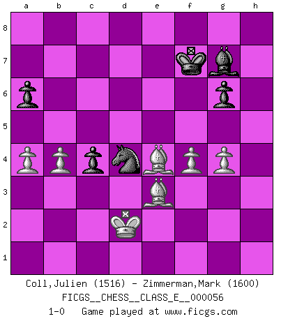 Last move : 1-0 2007 December 22 17:46:45 [Event "FICGS__CHESS__CLASS_E__000056"] [Site "FICGS"] [Date "2007.07.30"] [Round "1"] [White "Coll,Julien"] [Black "Zimmerman,Mark"] [Result "1-0"] [WhiteElo "1516"] [BlackElo "1600"] 1.e4 e5 2.Nf3 Nf6 3.Nxe5 Qe7 4.Nf3 Nxe4 5.Be2 d5 6.O-O Be6 7.d4 c6 8.Re1 Nd7 9.Bd3 Nef6 10.Ng5 g6 11.Qe2 Bg7 12.Nxe6 fxe6 13.Qxe6 Qxe6 14.Rxe6+ Kf7 15.Re2 Rae8 16.Nc3 Rxe2 17.Nxe2 Re8 18.Kf1 Ne4 19.f3 Nd6 20.c3 Nf8 21.Bf4 Ke6 22.Re1 Kd7 23.Bc1 Ne6 24.Nf4 b6 25.h4 c5 26.Nxe6 Rxe6 27.dxc5 bxc5 28.g4 Rxe1+ 29.Kxe1 Ke6 30.h5 Kf7 31.hxg6+ hxg6 32.Be3 c4 33.Bc2 a6 34.f4 Nb5 35.a4 Nc7 36.Kd2 Ne6 37.b4 d4 38.cxd4 Nxd4 39.Be4 1-0 Petrov's defense Kingside Castling by player White (move 6) Player White won this chess game. Follow this game move after move (download)Many have become Chess Masters, no one has become the Master of Chess. (Siegbert Tarrasch) Pläne sind die Träume des Verständigen. (Ernst Freiherr von Feuchtersleben) Todavía soy una víctima del Ajedrez. Tiene toda la belleza del arte y mucho mas. No puede ser comercializado. El Ajedrez es mas puro que el arte en su posición social. (Marcel Duchamp) D'abord les bases : Jouez et étudiez, puis étudiez et jouez, ensuite jouez et étudiez, puis étudiez et jouez. Deuxièmement : Donnez toujours le meilleur de vous-même ! (Ken Smith) If we knew what we were doing, we would not call it research. (Albert Einstein)