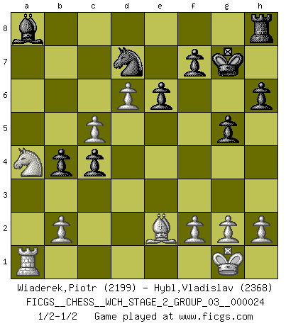Last move : 1/2-1/2 2022 June 7 23:48:56 [Event "FICGS__CHESS__WCH_STAGE_2_GROUP_03__000024"] [Site "FICGS"] [Date "2022.03.05"] [Round "1"] [White "Wiaderek,Piotr"] [Black "Hybl,Vladislav"] [Result "1/2-1/2"] [WhiteElo "2199"] [BlackElo "2368"] 1.d4 Nf6 2.c4 e6 3.Nf3 d5 4.Nc3 c6 5.Bg5 h6 6.Bh4 dxc4 7.e4 g5 8.Bg3 b5 9.Ne5 Nbd7 10.Be2 Bb7 11.O-O Bg7 12.Nxd7 Nxd7 13.Bd6 a6 14.a4 Bf8 15.Bxf8 Kxf8 16.e5 c5 17.axb5 axb5 18.dxc5 Qc7 19.Qd6+ Qxd6 20.exd6 b4 21.Rxa8+ Bxa8 22.Na4 Kg7 23.Ra1 1/2-1/2 Queen's pawn game Kingside Castling by player White (move 11) This chess game ended in a draw. Follow this game move after move (download)Chess is a terrific way for kids to build self image and self esteem. (Saudin Robovic) Das Schachspiel ist ein See, in welchem eine Mücke baden und ein Elefant ertrinken kann. (Emanuel Lasker) El ganar no lo es todo... pero el perder es nada. (Mednis) Les écrivains ont utilisé les échecs pour analyser les côtés extrêmes de la nature humaine. Dans ce cadre, les échecs offrent un champ d'expérimentation idéal. Mais on pourrait faire la même chose avec la peinture. Et là, en vous référant à Van Gogh, vous ne tirerez pas de conclusion définitive sur les peintres. (Gary Kasparov) The greatest con, that he ever pulled... was making you believe... that he is you. (Revolver, movie)