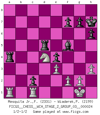 Last move : 1/2-1/2 2022 May 21 5:9:40 [Event "FICGS__CHESS__WCH_STAGE_2_GROUP_03__000024"] [Site "FICGS"] [Date "2022.03.05"] [Round "1"] [White "Mesquita Jr.,Fausto Monteiro"] [Black "Wiaderek,Piotr"] [Result "1/2-1/2"] [WhiteElo "2331"] [BlackElo "2199"] 1.d4 d5 2.c4 e6 3.Nc3 Nf6 4.Nf3 Bb4 5.cxd5 exd5 6.Bg5 h6 7.Bh4 O-O 8.e3 Bf5 9.Be2 Nbd7 10.Qb3 Qe7 11.a3 Bxc3+ 12.bxc3 c5 13.Qxb7 Rab8 14.Bxf6 Qe4 15.Qxa7 Nxf6 16.O-O Qc2 17.Rae1 c4 18.Ne5 Kh7 19.a4 Qxc3 20.Rc1 Qb3 21.Ra1 Qc2 22.Bf3 c3 23.Qa5 Ra8 24.Qc7 Rac8 25.Qd6 Qb2 26.Qa3 Qxa3 27.Rxa3 c2 28.R3a1 Ne4 29.Bxe4 dxe4 30.d5 Rc5 31.Rfc1 Ra8 32.h3 Rxd5 33.Nc6 Rxa4 34.Nd4 1/2-1/2 QGD : Ragozin variation Kingside Castling by player Black (move 7) Kingside Castling by player White (move 16) This chess game ended in a draw. Follow this game move after move (download)Personally, I rather look forward to a computer program winning the world Chess Championship. Humanity needs a lesson in humility. (Richard Dawkings) Fallen sollten polizeilich verboten werden. (Savielly Grigorievitsch Tartakower) Mi estilo es algo parecido entre un poco de Tal y Petrosian. (Reshevsky) Votre seul travail dans les ouvertures est d'obtenir un milieu de partie jouable. (Lajos Portish) An expert is a man who has made all the mistakes which can be made in a very narrow field. (Niels Bohr)