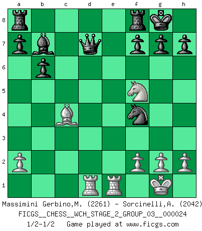 Last move : 1/2-1/2 2022 April 21 8:58:50 [Event "FICGS__CHESS__WCH_STAGE_2_GROUP_03__000024"] [Site "FICGS"] [Date "2022.03.05"] [Round "1"] [White "Massimini Gerbino,Massimiliano"] [Black "Sorcinelli,Andrea"] [Result "1/2-1/2"] [WhiteElo "2261"] [BlackElo "2042"] 1.d4 Nf6 2.c4 e6 3.Nf3 d5 4.Nc3 c5 5.cxd5 Nxd5 6.e4 Nxc3 7.bxc3 cxd4 8.cxd4 Bb4+ 9.Bd2 Bxd2+ 10.Qxd2 O-O 11.Bc4 Nd7 12.O-O b6 13.Rfe1 Bb7 14.Rad1 Nf6 15.d5 exd5 16.exd5 Qd6 17.Nd4 Qd7 18.Qf4 Nxd5 19.Nf5 Nxf4 1/2-1/2 Queen's pawn game Kingside Castling by player Black (move 10) Kingside Castling by player White (move 12) This chess game ended in a draw. Follow this game move after move (download)Could we look into the head of a Chess player, we should see there a whole world of feelings, images, ideas, emotion and passion. (Alfred Binet) Ein Teil des Fehlers ist immer korrekt. (Savielly Grigorievitsch Tartakower) EL Ajedrez es como la vida. (Boris Spassky) Un millionnaire : 'Monsieur Steinitz ! Vous ne participez aux tournois que pour l'argent, alors que moi je n'y viens que pour l'honneur.' Steinitz : 'Chacun joue pour ce qu'il n'a pas'... Have no fear of perfection - you'll never reach it. (Salvador Dali)
