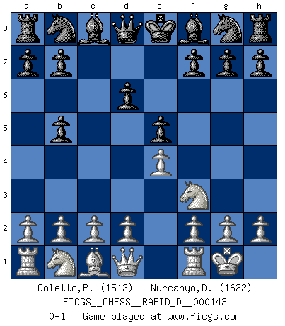 Last move : 0-1 2022 April 17 7:59:53 [Event "FICGS__CHESS__RAPID_D__000143"] [Site "FICGS"] [Date "2022.03.11"] [Round "1"] [White "Goletto,Piero Giuseppe"] [Black "Nurcahyo,Dery"] [Result "0-1"] [WhiteElo "1512"] [BlackElo "1622"] 1.e4 e5 2.Nf3 d6 3.Bb5+ c6 4.O-O cxb5 0-1 This chess game has been lost on time (started : 2022.03.11 5:42:41) Philidor's defense Kingside Castling by player White (move 4) Player Black won this chess game. Follow this game move after move (download)The Chess pieces are the block alphabet which shapes thoughts; and these thoughts, although making a visual design on the chessboard, express their beauty abstractly, like a poem. (Marcel Duchamp) Er war ein guter Schachspieler, aber ich kann Leute nicht ausstehen, die 'Heil Hitler' rufen (Über Alexander Aljechin). (Miguel Najdorf) No soy una persona materialista y por eso, no resiento la falta o pérdida del dinero. La ausencia de cosas mundanas carece de importancia. Ya que el Ajedrez es una forma en la que puedo ser tan materialista como yo desee sin tener la necesidad de vender mi alma. (Jamie Walter Adams) L'attaque fait le spectacle, la défense gagne les matchs. (Dicton footballistique) History is a gallery of pictures in which there are few originals and many copies. (Alexis de Tocqueville)