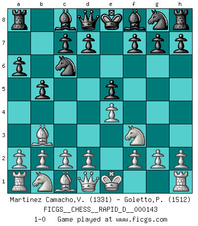 Last move : 1-0 2022 April 17 20:18:18 [Event "FICGS__CHESS__RAPID_D__000143"] [Site "FICGS"] [Date "2022.03.11"] [Round "1"] [White "Martinez Camacho,Victor Hugo"] [Black "Goletto,Piero Giuseppe"] [Result "1-0"] [WhiteElo "1331"] [BlackElo "1512"] 1.e4 e5 2.Nf3 Nc6 3.Bb5 a6 4.Ba4 b5 5.Bb3 1-0 This chess game has been lost on time (started : 2022.03.11 5:42:41) Ruy Lopez : Caro variation Player White won this chess game. Follow this game move after move (download)Chess is imagination. (David Bronstein) Am wohlsten fühle ich mich, wenn ich sehe, wie sich mein Gegner im Todeskampf windet. (Robert James Fischer) Jugadores de primera clase pierden en contra de jugadores de segunda clase porque los jugadores de segunda clase a veces juegan una partida de primer clase. (Siegbert Tarrasch) Avant la finale, les dieux ont créé le milieu de partie. (Tarrasch) Logic : The art of thinking and reasoning in strict accordance with the limitations and incapacities of the human misunderstanding. (Ambrose Bierce)