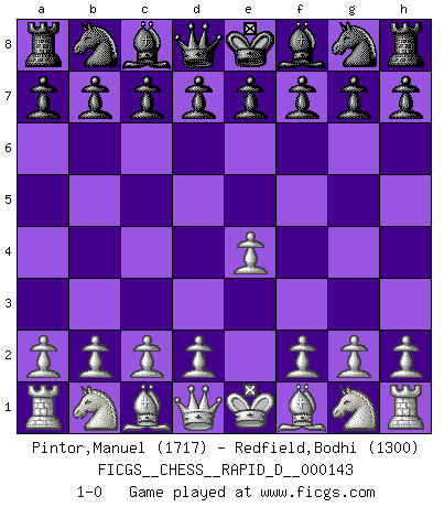 Last move : 1-0 2022 April 10 18:57:47 [Event "FICGS__CHESS__RAPID_D__000143"] [Site "FICGS"] [Date "2022.03.11"] [Round "1"] [White "Pintor,Manuel"] [Black "Redfield,Bodhi"] [Result "1-0"] [WhiteElo "1717"] [BlackElo "1300"] 1.e4 1-0 This chess game has been lost on time (started : 2022.03.11 5:42:41) King's pawn Opening Player White won this chess game. Follow this game move after move (download)The game of Chess is not merely an idle amusement; several very valuable qualities of the mind are to be acquired and strengthened by it, so as to become habits ready on all occasions; for life is a kind of Chess. (Benjamin Franklin) Im Schach gibt es keinen Platz für Galanterie. (Irving Chernev) Un buen jugador siempre tiene buena suerte. (José Raúl Capablanca) L'ordinateur a tué l'originalité. Il n'y a plus guère d'aventures sur l'échiquier. (Jacob Murray) The right perception of any matter and a misunderstanding of the same matter do not wholly exclude each other. (Kafka's the trial)
