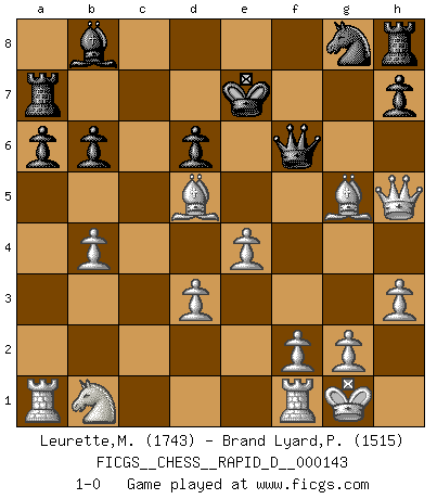 Last move : 1-0 2022 March 13 18:7:0 [Event "FICGS__CHESS__RAPID_D__000143"] [Site "FICGS"] [Date "2022.03.11"] [Round "1"] [White "Leurette,Marc-Antoine"] [Black "Brand Lyard,Paul"] [Result "1-0"] [WhiteElo "1743"] [BlackElo "1515"] 1.e4 e5 2.Nf3 Nc6 3.Bc4 Bc5 4.c3 d6 5.b4 Bb6 6.a4 a6 7.a5 Ba7 8.O-O Bg4 9.h3 Bxf3 10.Qxf3 f6 11.d3 Bb8 12.Be3 b5 13.axb6 cxb6 14.Bd5 Nd4 15.cxd4 Ra7 16.dxe5 g5 17.exf6 Qxf6 18.Qh5+ Ke7 19.Bxg5 1-0 Giuoco Piano Kingside Castling by player White (move 8) Player White won this chess game. Follow this game move after move (download)Chess is like life. (Boris Spassky) Warum muß ich gegen diesen IDIOTEN verlieren? (Aaron Nimzowitsch) Si tu oponente te ofrece un empate, trata de averiguar porque piensa él que esta en una posición peor. (Nigel Short) J'ai toujours senti une vague pitié pour l'homme qui ne connaît rien aux échecs, tout comme j'en aurais pour un homme ignorant de l'amour. Les Echecs, comme la musique ou comme l'amour, ont le pouvoir de rendre heureux. (Siegbert Tarrasch) As the days dwindle down... to a precious few. (Maxwell Anderson)