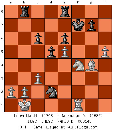 Last move : 0-1 2022 May 7 16:45:47 [Event "FICGS__CHESS__RAPID_D__000143"] [Site "FICGS"] [Date "2022.03.11"] [Round "1"] [White "Leurette,Marc-Antoine"] [Black "Nurcahyo,Dery"] [Result "0-1"] [WhiteElo "1743"] [BlackElo "1622"] 1.e4 e5 2.Nf3 d6 3.Nc3 c6 4.d4 exd4 5.Qxd4 h6 6.Bd2 Be6 7.e5 d5 8.O-O-O Nd7 9.g3 Bc5 10.Qd3 Bxf2 11.Be3 Bxe3+ 12.Qxe3 Nb6 13.h3 Ne7 14.Ne4 Nf5 15.Qa3 Nc8 16.g4 Nfe7 17.Nc5 O-O 18.Nxb7 Qb6 19.Nc5 Ng6 20.Nd4 Re8 21.Ndxe6 fxe6 22.Nd3 Nce7 23.h4 Qe3+ 24.Kb1 Rab8 25.Re1 Qf3 26.Be2 Qe3 27.g5 Nf5 28.gxh6 Qxh6 29.h5 Nge7 30.Rhg1 Nd4 31.Qxa7 Nb5 32.Qf2 Nc3+ 33.Ka1 Ne4 34.Qf4 Qxf4 35.Nxf4 Nf5 36.Bg4 Nd4 37.c3 Nc2+ 38.Kb1 Nxe1 39.Rxe1 Kf7 40.Rf1 Nd2+ 0-1 Philidor's defense Queenside Castling by player White (move 8) Kingside Castling by player Black (move 17) Player Black won this chess game. Follow this game move after move (download)During a Chess competition a Chessmaster should be a combination of a beast of prey and a monk. (Alexander Alekhine) Ich hatte meine größten Erfolge, als ich 47 Jahre alt war. Kasparow war noch nicht mal 42 und hat das Schach schon im Stich gelassen. (Viktor Kortschnoi) A través de las casillas del tablero, los Indios explican el movimiento del tiempo y la edad, las influencias mas altas que controlan el mundo y los lazos que vinculan al Ajedrez con el alma humana. (Al-Masudi) Les sacrifices démontrent seulement que quelqu'un a gaffé. (Savielly Tartacover) Life is pleasant. Death is peaceful. It's the transition that's troublesome. (Isaac Asimov)