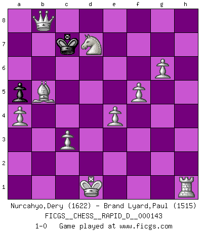 Last move : 1-0 2022 May 26 5:16:2 [Event "FICGS__CHESS__RAPID_D__000143"] [Site "FICGS"] [Date "2022.03.11"] [Round "1"] [White "Nurcahyo,Dery"] [Black "Brand Lyard,Paul"] [Result "1-0"] [WhiteElo "1622"] [BlackElo "1515"] 1.e4 e5 2.Ne2 Bc5 3.c3 d6 4.d3 Bg4 5.f3 Be6 6.Nd2 Nc6 7.Nb3 Bxb3 8.Qxb3 Qb8 9.Ng3 f6 10.Nf5 Nh6 11.Nxg7+ Kf8 12.Nh5 Qd8 13.Bxh6+ Ke7 14.Bg7 Rg8 15.Bxf6+ Ke8 16.Qxg8+ Kd7 17.Qg4+ Ke8 18.Bxd8 Nxd8 19.Nf6+ Ke7 20.Nd5+ Ke8 21.Nxc7+ Kf8 22.Qf5+ Ke7 23.Qxh7+ Nf7 24.Qf5 Rg8 25.Qe6+ Kf8 26.Qe8+ Kg7 27.Qe7 d5 28.Nxd5 Bxe7 29.Nxe7 Rd8 30.Nf5+ Kf6 31.O-O-O b5 32.h4 a5 33.d4 b4 34.Kc2 exd4 35.Nxd4 bxc3 36.bxc3 Ne5 37.a4 Kg6 38.Ne6 Rxd1 39.Kxd1 Kf6 40.Nd8 Nc6 41.Nxc6 Kg6 42.g4 Kh6 43.Bb5 Kg6 44.f4 Kf6 45.h5 Kg7 46.g5 Kg8 47.h6 Kh7 48.f5 Kg8 49.Ne5 Kf8 50.g6 Ke7 51.h7 Kd6 52.h8Q Kc5 53.Qf8+ Kb6 54.Nd7+ Kc7 55.Qb8+ 1-0 Alapin's Opening Queenside Castling by player White (move 31) Promotion Queen by player White (move 52) Player White won this chess game. Follow this game move after move (download)Chess is a beautiful mistress. (Bent Larsen) Stil? Ich habe keinen Stil! (Anatoly Karpov) La mitad de las variaciones que son calculadas en una partida de torneo, resultan ser completamente superfluas. Desafortunadamente, nadie sabe por adelantado cual mitad. (Jan Tinman) La victoire dans une partie d'Echecs appartient la plupart du temps à celui qui voit un peu plus loin que l'adversaire. (Lasker) Everything in life is luck. (Donald Trump)