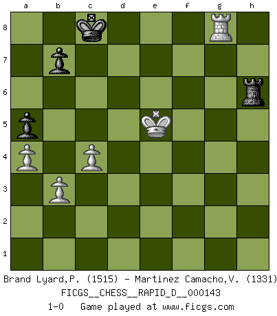 Last move : 1-0 2022 May 27 6:8:40 [Event "FICGS__CHESS__RAPID_D__000143"] [Site "FICGS"] [Date "2022.03.11"] [Round "1"] [White "Brand Lyard,Paul"] [Black "Martinez Camacho,Victor Hugo"] [Result "1-0"] [WhiteElo "1515"] [BlackElo "1331"] 1.c4 c5 2.Nc3 Nf6 3.d3 e5 4.Bg5 d6 5.Bxf6 Qxf6 6.Nd5 Qd8 7.Qa4+ Bd7 8.Qb3 Bc6 9.e4 Nd7 10.O-O-O Bxd5 11.exd5 Rb8 12.Be2 Qb6 13.Qxb6 Nxb6 14.b3 a5 15.a4 Be7 16.h4 Nd7 17.Bg4 Nf6 18.f3 Nxg4 19.fxg4 Kd7 20.g5 Rbf8 21.g4 f6 22.Rf1 fxg5 23.Rxf8 Rxf8 24.hxg5 Bxg5+ 25.Kb2 Rf2+ 26.Kc3 h6 27.Nh3 Rg2 28.Nxg5 hxg5 29.Rh7 Rxg4 30.Rxg7+ Kc8 31.Rg8+ Kc7 32.Rg7+ Kb8 33.Rd7 Rg3 34.Rxd6 g4 35.Re6 Rf3 36.Rxe5 g3 37.Rg5 Kc7 38.Rg7+ Kc8 39.d6 g2 40.Rxg2 Rf6 41.d4 cxd4+ 42.Kxd4 Rxd6+ 43.Ke5 Rh6 44.Rg8+ 1-0 English : Symmetrical variation Queenside Castling by player White (move 10) 10 pieces endgame at move 42 : White KRPPPP , Black KRPP WHITE : King + 1 Rook 4 Pawns BLACK : King + 1 Rook 2 Pawns 9 pieces endgame at move 42 : White KRPPP , Black KRPP WHITE : King + 1 Rook 3 Pawns BLACK : King + 1 Rook 2 Pawns Player White won this chess game. Follow this game move after move (download)I like the moment when I break a man's ego. (Bobby Fischer) Fallen sollten polizeilich verboten werden. (Savielly Grigorievitsch Tartakower) Mi estilo es algo parecido entre un poco de Tal y Petrosian. (Reshevsky) Le jeu d'échecs fait naître et fortifie en nous plusieurs qualités précieuses dans le cours de l'existence, telles que la prévoyance, la circonspection, la prudence, et la persévérance. (Benjamin Franklin - 1783, la morale des échecs) You have to believe in yourself. (Sun Tzu)