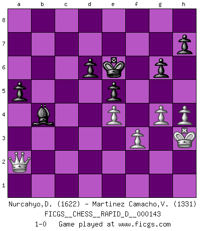 Last move : 1-0 2022 July 8 6:53:18 [Event "FICGS__CHESS__RAPID_D__000143"] [Site "FICGS"] [Date "2022.03.11"] [Round "1"] [White "Nurcahyo,Dery"] [Black "Martinez Camacho,Victor Hugo"] [Result "1-0"] [WhiteElo "1622"] [BlackElo "1331"] 1.e4 e5 2.Nc3 Nf6 3.f3 Bc5 4.Bc4 a6 5.a3 O-O 6.Nge2 b5 7.Ba2 Bb7 8.d3 d6 9.Ng3 Nbd7 10.b4 Ba7 11.Bb2 Rc8 12.Qd2 c5 13.Nf5 Nb8 14.Qg5 g6 15.h4 Nh5 16.Qg4 cxb4 17.axb4 Nc6 18.Nd5 Kh8 19.Ng3 Nxg3 20.Qxg3 Nd4 21.Bxd4 Bxd4 22.O-O-O Bxd5 23.Bxd5 Rc3 24.Kd2 Qc7 25.Bb3 Rc8 26.Rc1 Qb6 27.Qe1 R3c6 28.Qe2 Bc3+ 29.Kd1 Bxb4 30.c4 bxc4 31.Bxc4 Rc5 32.Qa2 Qa7 33.Ke2 a5 34.Rc2 Kg7 35.Rhc1 R8c7 36.Bb3 Rxc2+ 37.Rxc2 Rxc2+ 38.Qxc2 Qg1 39.d4 Qxd4 40.Kf1 Qc3 41.Qd1 Qd2 42.Qb1 Qe3 43.Qa2 Qd3+ 44.Kg1 Bc5+ 45.Kh2 Qe3 46.Bxf7 Qg1+ 47.Kg3 Qf2+ 48.Kh3 Bb4 49.Qxf2 Kxf7 50.g4 Ke6 51.Qa2+ 1-0 This chess game has been lost on time (started : 2022.03.11 5:42:41) Vienna : Falkbeer variation Kingside Castling by player Black (move 5) Queenside Castling by player White (move 22) Player White won this chess game. Follow this game move after move (download)A strong memory, concentration, imagination, and a strong will is required to become a great Chess player. (Bobby Fischer) Vielleicht wirkt die Aura früherer Spieler glanzvoller als die der heutigen Spieler, aber das liegt daran, dass man kein Programm wie Fritz hatte, das einem all die Löcher in ihren Partien zeigt. (Vladimir Kramnik) Uno por uno, yo los acribillé, mi superioridad muy pronto se volvio aparente. (Jose Capablanca) Les erreurs sont comme les malheurs, elles n'arrivent jamais seules. (Siegbert Tarrasch) If we knew what we were doing, we would not call it research. (Albert Einstein)
