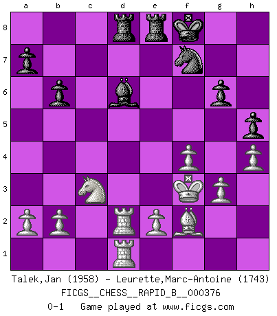 Last move : 0-1 2022 May 13 18:55:26 [Event "FICGS__CHESS__RAPID_B__000376"] [Site "FICGS"] [Date "2022.03.12"] [Round "1"] [White "Talek,Jan"] [Black "Leurette,Marc-Antoine"] [Result "0-1"] [WhiteElo "1958"] [BlackElo "1743"] 1.Nh3 e5 2.d4 exd4 3.Qxd4 Nc6 4.Qa4 d5 5.g3 Nf6 6.Bg2 Be7 7.Nf4 Be6 8.O-O O-O 9.c4 dxc4 10.Nxe6 fxe6 11.Qxc4 Qd7 12.Nc3 Ne5 13.Qb5 Qxb5 14.Nxb5 Nd5 15.Bxd5 exd5 16.Nxc7 Rac8 17.Nxd5 Bd6 18.Rd1 Nf7 19.Be3 b6 20.Rac1 Rcd8 21.Kg2 Rfe8 22.Rc2 h6 23.h4 Be5 24.Rcd2 Bd6 25.f3 Rd7 26.f4 Kf8 27.Bf2 h5 28.Nc3 g6 29.Kf3 R7d8 0-1 This chess game has been lost on time (started : 2022.03.12 1:59:46) Amar (Paris) Opening Kingside Castling by player White (move 8) Kingside Castling by player Black (move 8) Player Black won this chess game. Follow this game move after move (download)If Chess is a science, it's a most inexact one. If Chess is an art, it is too exacting to be seen as one. If Chess is a sport, it's too esoteric. If Chess is a game, it's too demanding to be just a game. If Chess is a mistress, she's a demanding one. If Chess is a passion, it's a rewarding one. If Chess is life, it's a sad one. (Unknown) Versuche, dich von der Sklaverei der Eröffnungsvarianten zu befreien. Stattdessen soll man gewisse Typenpositionen erlernen, die man eingehend analysiert. (Aaron Nimzowitsch) El jugador táctico sabe que hacer cuando hay algo que hacer; mientras que el estratega sabe que hacer cuando no hay nada que hacer. (Gerald Abrahams) Les réformistes prétendent que les progrès de la théorie conduiront à la disparition des échecs, et qu'il faut, pour leur rendre vie, en remanier les règles. En réalité, qu'exprime cette affirmation? Le mépris de l'intuition, de l'imagination et de tous les autres éléments qui font des échecs un art. (Alexander Alekhine) There is a great deal of difference between an eager man who wants to read a book and a tired man who wants a book to read. (G.K. Chesterton)