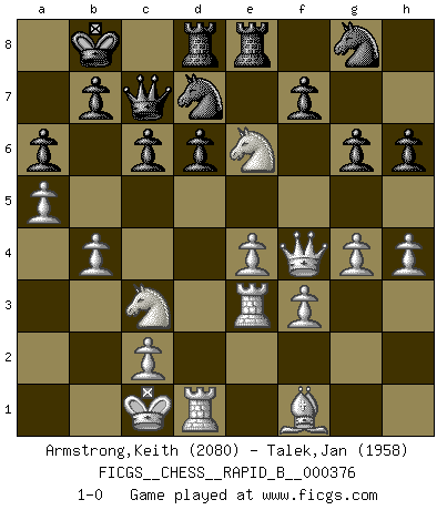 Last move : 1-0 2022 May 12 18:10:31 [Event "FICGS__CHESS__RAPID_B__000376"] [Site "FICGS"] [Date "2022.03.12"] [Round "1"] [White "Armstrong,Keith"] [Black "Talek,Jan"] [Result "1-0"] [WhiteElo "2080"] [BlackElo "1958"] 1.e4 g6 2.d4 Bg7 3.Nc3 d6 4.Be3 Nf6 5.Qd2 Nbd7 6.O-O-O c6 7.Bh6 Bxh6 8.Qxh6 e5 9.Nf3 Qe7 10.a4 a6 11.a5 exd4 12.Nxd4 Nc5 13.f3 Bd7 14.Bc4 O-O-O 15.Rhe1 Be6 16.Bf1 Qc7 17.b4 Ncd7 18.Qf4 Rhe8 19.g4 Kb8 20.Re3 h6 21.h4 Ng8 22.Nxe6 1-0 This chess game has been lost on time (started : 2022.03.12 1:59:46) Robatsch (Modern) defense Queenside Castling by player White (move 6) Queenside Castling by player Black (move 14) Player White won this chess game. Follow this game move after move (download)The blunders are all there on the board, waiting to be made. (Savielly Tartakover) Ein Teil des Fehlers ist immer korrekt. (Savielly Grigorievitsch Tartakower) La estratégia requiere pensar, la táctica requiere observación. (Max Euwe) Le profane ne songe pas à la somme de jouissance dont il se prive, qui méconnaît ce jeu aux ressources aussi variées que passionnantes. (Jean-Marie Jeanton-Lamarche) A belief is an idea the mind possesses, an idea that possesses the mind. (Robert Oxden Bolton)