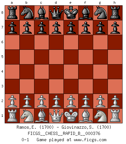 Last move : 0-1 2022 April 11 7:53:34 [Event "FICGS__CHESS__RAPID_B__000376"] [Site "FICGS"] [Date "2022.03.12"] [Round "1"] [White "Ramos,Edson"] [Black "Giovinazzo,Salvatore"] [Result "0-1"] [WhiteElo "1700"] [BlackElo "1700"] 0-1 This chess game has been lost on time (started : 2022.03.12 1:59:46) Player Black won this chess game. Follow this game move after move (download)One doesn't have to play well, it's enough to play better than your opponent. (Siegbert Tarrasch) Nie in meinem Leben habe ich die französische Verteidigung gespielt, welche die Stumpfsinnigste von allen ist. (Wilhelm Steinitz) Yo considero que Fischer es uno de los expertos mas grandes de aperturas de siempre. (Keith Hayward) Ne tendez aucun piège pour le plaisir ! Ne jouez rien dans l'espoir que l'adversaire réagisse de façon stupide ! Prenez toujours pour acquis que l'adversaire va trouver le meilleur coup ! Ne jouez jamais de coup dans l'espoir que l'adversaire ne voie pas la menace ! Chacun de vos coups doit améliorer la position d'une façon ou d'une autre. If you are going through hell, keep going. (Winston Churchill)
