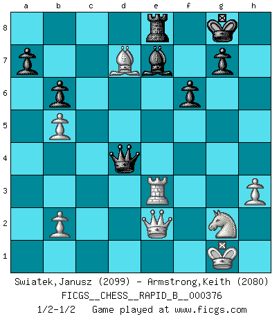 Last move : 1/2-1/2 2022 May 5 1:28:28 [Event "FICGS__CHESS__RAPID_B__000376"] [Site "FICGS"] [Date "2022.03.12"] [Round "1"] [White "Swiatek,Janusz"] [Black "Armstrong,Keith"] [Result "1/2-1/2"] [WhiteElo "2099"] [BlackElo "2080"] 1.d4 Nf6 2.c4 e6 3.g3 d5 4.Bg2 Bb4+ 5.Bd2 Be7 6.Nf3 O-O 7.Qc2 c6 8.O-O b6 9.cxd5 cxd5 10.Rc1 Bb7 11.Ne5 Ne4 12.a3 Bd6 13.Bb4 f6 14.Nd3 Nc6 15.e3 Rc8 16.Nc3 Nxb4 17.axb4 Bb8 18.b5 Qd7 19.Bf1 e5 20.Qd1 exd4 21.exd4 Qf7 22.Bg2 h5 23.Na2 h4 24.Nab4 Rxc1 25.Rxc1 Re8 26.Nc6 Bd6 27.gxh4 Bc8 28.f3 Qg6 29.fxe4 dxe4 30.Ne1 Qh6 31.Rc3 Qxh4 32.h3 e3 33.Qe2 Qg3 34.Ne7+ Bxe7 35.Rxe3 Qd6 36.Bc6 Bd7 37.Ng2 Qxd4 38.Bxd7 1/2-1/2 Catalan : Closed Kingside Castling by player Black (move 6) Kingside Castling by player White (move 8) This chess game ended in a draw. Follow this game move after move (download)After black's reply to 1.e4 with 1..e5, leaves him always trying to get into the game. (Howard Staunton) Obwohl ich vom Stil her kaum zu den Priestern der Schachkunst gezählt werde, halte ich Schach doch für eine Kunst. (Tigran Petrosjan) Un buen jugador siempre tiene buena suerte. (José Raúl Capablanca) L'action d'une oeuvre littéraire se déroule sur un champ de bataille. Les masques et les types du drame moderne correspondent aux pièces du jeu d'échecs. L'intrigue correspond aux coups et aux gambits, c'est à dire aux techniques du jeu telles qu'utilisées et interprétées par les joueurs. Les tactiques et les péripéties [mouvements] correspondent aux coups exécutés par l'adversaire. (Viktor Shklovsky) The hypothalamus is one of the most important parts of the brain, involved in many kinds of motivation, among other functions. The hypothalamus controls the 'Four Fs: Fighting, Fleeing, Feeding and Mating. (Unknown author)
