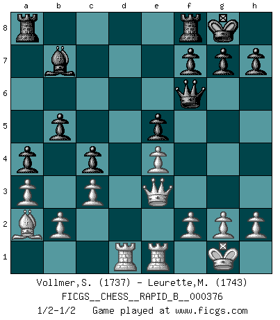 Last move : 1/2-1/2 2022 March 15 21:31:49 [Event "FICGS__CHESS__RAPID_B__000376"] [Site "FICGS"] [Date "2022.03.12"] [Round "1"] [White "Vollmer,Steve"] [Black "Leurette,Marc-Antoine"] [Result "1/2-1/2"] [WhiteElo "1737"] [BlackElo "1743"] 1.e4 e5 2.Nf3 Nc6 3.Bb5 Nf6 4.O-O Nxe4 5.Re1 Nd6 6.Nxe5 Nxe5 7.Rxe5+ Be7 8.Ba4 O-O 9.d3 Bf6 10.Re1 c6 11.Nc3 b5 12.Bb3 a5 13.a3 a4 14.Ba2 Bb7 15.Ne4 Nxe4 16.dxe4 d6 17.c3 c5 18.Bf4 Be5 19.Qd2 c4 20.Rad1 Qf6 21.Bxe5 dxe5 22.Qe3 1/2-1/2 Ruy Lopez : Berlin defense, Open variation Kingside Castling by player White (move 4) Kingside Castling by player Black (move 8) This chess game ended in a draw. Follow this game move after move (download)Mistrust is the most necessary characteristic of the Chess player. (Siegbert Tarrasch) Kasparov stellt für gewöhnlich die Regeln auf und bricht sie dann selbst wieder. (Alexej Shirov) Prefiero perder una partida realmente buena, que ganar una mala. (David Levy) Le jeu d'échecs est comme rejeté hors du temps. (Antoine de Saint-Exupéry) Happy endings are just stories that haven't finished yet. (Jane Smith in Mr & Mrs Smith)