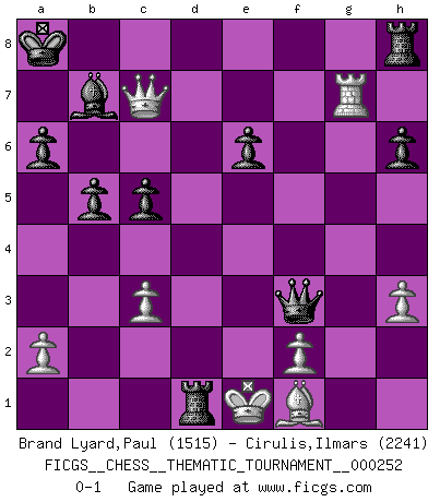 Last move : 0-1 2022 March 14 14:2:10 [Event "FICGS__CHESS__THEMATIC_TOURNAMENT__000252"] [Site "FICGS"] [Date "2022.03.12"] [Round "1"] [White "Brand Lyard,Paul"] [Black "Cirulis,Ilmars"] [Result "0-1"] [WhiteElo "1515"] [BlackElo "2241"] 1.d4 d5 2.Nf3 Nf6 3.c4 e6 4.Nc3 c6 5.Qd3 dxc4 6.Qxc4 b5 7.Qd3 a6 8.g4 Nxg4 9.h3 Nf6 10.Bg5 h6 11.Bxf6 gxf6 12.e4 Bb7 13.Rg1 Nd7 14.Rd1 Qc7 15.Rg2 O-O-O 16.e5 Nxe5 17.Nxe5 fxe5 18.Qe3 exd4 19.Rxd4 Bd6 20.Rg1 c5 21.Rdg4 Kb8 22.Rg7 Be5 23.Rxf7 Bxc3+ 24.bxc3 Qxf7 25.Qe5+ Ka8 26.Rg7 Qf3 27.Qc7 Rd1+ 0-1 Queen's pawn game Queenside Castling by player Black (move 15) Player Black won this chess game. Follow this game move after move (download)It's always better to sacrifice your opponent's men. (Savielly Tartakover) Schach ist das schnellste Spiel der Welt, weil man in jeder Sekunde Tausende von Gedanken ordnen muß. (Albert Einstein) Tu puedes aprender mucho mas de una partida que pierdas que de una partida ganada. Tendras que perder cientos de partidas antes de llegar a ser un buen jugador. (Jose Raul Capablanca) Des combinaisons [dans le jeu d'échecs] pareilles à des mélodies. Je crois entendre pour ainsi dire la musique des coups... (Vladimir Nabokov) The faster the computer, the slower the brain. (Thibault de Vassal)