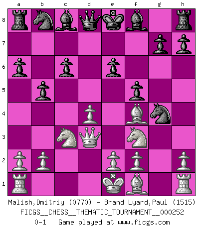 Last move : 0-1 2022 May 13 18:55:26 [Event "FICGS__CHESS__THEMATIC_TOURNAMENT__000252"] [Site "FICGS"] [Date "2022.03.12"] [Round "1"] [White "Malish,Dmitriy"] [Black "Brand Lyard,Paul"] [Result "0-1"] [WhiteElo "0770"] [BlackElo "1515"] 1.d4 d5 2.Nf3 Nf6 3.c4 e6 4.Nc3 c6 5.Qd3 dxc4 6.Qxc4 b5 7.Qd3 a6 8.g4 Nxg4 9.Bg5 f6 10.Bf4 f5 0-1 Queen's pawn game Player Black won this chess game. Follow this game move after move (download)Chess is so inspiring that I do not believe a good player is capable of having an evil thought during the game. (Wilhelm Steinitz) Schach ist die gewalttätigste aller Sportarten. (Garry Kasparov) El Ajedrez moderno está demasiado preocupado con cosas como la estructura de Peones. Olvidenlo, el Jaque Mate termina la partida. (Nigel Short) La victoire dans une partie d'Echecs appartient la plupart du temps à celui qui voit un peu plus loin que l'adversaire. (Lasker) Patience, use the Force, think ! (Obi-Wan Kenobi in Star Wars ep.2)