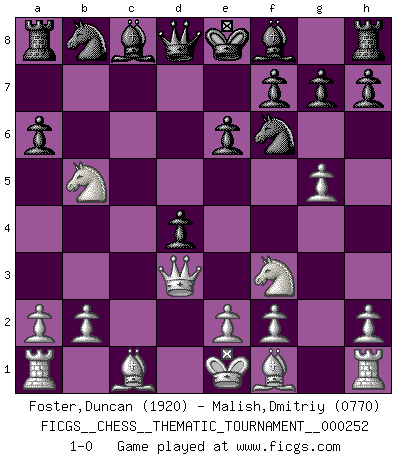 Last move : 1-0 2022 April 26 4:49:14 [Event "FICGS__CHESS__THEMATIC_TOURNAMENT__000252"] [Site "FICGS"] [Date "2022.03.12"] [Round "1"] [White "Foster,Duncan"] [Black "Malish,Dmitriy"] [Result "1-0"] [WhiteElo "1920"] [BlackElo "0770"] 1.d4 d5 2.Nf3 Nf6 3.c4 e6 4.Nc3 c6 5.Qd3 dxc4 6.Qxc4 b5 7.Qd3 a6 8.g4 c5 9.g5 cxd4 10.Nxb5 1-0 This chess game has been lost on time (started : 2022.03.12 10:50:16) Queen's pawn game Player White won this chess game. Follow this game move after move (download)Live, lose, and learn, by observing your opponent how to win. (Amber Steenbock) Ich brauche nur einen Blick auf das Schachbrett zu werfen, und weiß schon, was in der Stellung steckt, was geschehen kann und was geschehen wird. Alle übrigen suchen und prüfen, ich aber weiß es! (José Raúl Capablanca) Morphy probablemente fue el genio más grande de todos. (Bobby Fischer) Le jeu d'échecs est comme rejeté hors du temps. (Antoine de Saint-Exupéry) Life is pain my dear and anyone who says otherwise is selling something. (Princess Bride)
