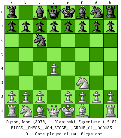 Last move : 1-0 2022 April 16 7:30:22 [Event "FICGS__CHESS__WCH_STAGE_1_GROUP_01__000025"] [Site "FICGS"] [Date "2022.03.14"] [Round "1"] [White "Dyson,John"] [Black "Olesinski,Eugeniusz"] [Result "1-0"] [WhiteElo "2079"] [BlackElo "1918"] 1.Nf3 Nc6 2.d4 1-0 This chess game has been lost on time (started : 2022.03.14 20:59:46) Reti Opening Player White won this chess game. Follow this game move after move (download)The only thing Chess players have in common is Chess. (Lodewijk Prins) Der Schachmeister von Heute braucht Courage, einen Killerinstinkt, Ausdauer und Arroganz. (Larry Evans) Las ideas audaces son como las piezas del Ajedrez que avanzan hacia adelante. Ellas pueden ser vencidas, pero también pueden iniciar una partida victoriosa. (Goethe) Les Echecs ne sont pas pour les âmes timides. Ils requièrent un homme entier, qui ne s'arrête pas aveuglément à ce qui a été déjà établi, mais qui tente individuellement de sonder les profondeurs du jeu. (W. Steinitz) At last I discovered the true beauty of chess. So I proposed to her. (Dinesh De Silva)