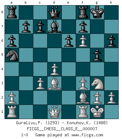 Last move : 1-0 2006 October 22 1:12:40 [Event "FICGS__CHESS__CLASS_E__000007"] [Site "FICGS"] [Date "2006.06.27"] [Round "1"] [White "Guralivu,Paul-Iosif"] [Black "Konuhov,Konstantin"] [Result "1-0"] [WhiteElo "1293"] [BlackElo "1488"] 1.d4 Nf6 2.c4 d5 3.Nc3 dxc4 4.e4 e6 5.Bxc4 Bb4 6.f3 Nc6 7.Nge2 Bd7 8.O-O O-O 9.Bg5 h6 10.Bh4 g5 11.Bf2 Na5 12.Bd3 Qe8 13.e5 Bxc3 14.bxc3 a6 15.exf6 Qd8 16.Ng3 1-0 Queen's pawn game Kingside Castling by player White (move 8) Kingside Castling by player Black (move 8) Player White won this chess game. Follow this game move after move (download)Chess is a part of culture and if a culture is declining then Chess too will decline. (Mikhail Botvinnik) Frage des Reporters: -Worin besteht das Ziel von Gambiteröffnungen? Antwort: -Auf Kosten der Partie einen Ruf als Angriffspieler zu erwerben.- (Siegbert Tarrasch) El Ajedrez es el arte del análisis. (Mikhail Botvinnik) Pour se monter efficace, un Cavalier a besoin d'avant-postes ! Les Cavaliers font les meilleurs bloqueurs de pions passés. There is no vagueness without wind. (Chinese proverb)