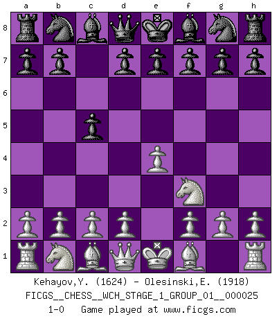 Last move : 1-0 2022 April 26 4:49:14 [Event "FICGS__CHESS__WCH_STAGE_1_GROUP_01__000025"] [Site "FICGS"] [Date "2022.03.14"] [Round "1"] [White "Kehayov,Yulian"] [Black "Olesinski,Eugeniusz"] [Result "1-0"] [WhiteElo "1624"] [BlackElo "1918"] 1.e4 c5 2.Nf3 1-0 This chess game has been lost on time (started : 2022.03.14 20:59:46) Sicilian defense Player White won this chess game. Follow this game move after move (download)Chess is the art of analysis. (Mikhail Botvinnik) Sitze auf Deine Hände. (Siegbert Tarrasch) Cada Peón es una Reina en potencia. (James Mason) Karpov est une pièce de musée. (Garry Kasparov) When the going gets tactical, the computers get going. (Hyatt)