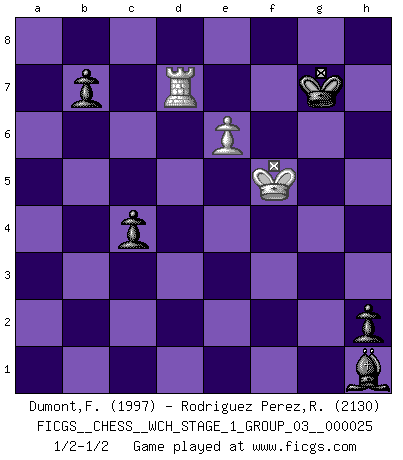 Last move : 1/2-1/2 2022 August 29 10:1:25 [Event "FICGS__CHESS__WCH_STAGE_1_GROUP_03__000025"] [Site "FICGS"] [Date "2022.03.14"] [Round "1"] [White "Dumont,Freddy"] [Black "Rodriguez Perez,Rene"] [Result "1/2-1/2"] [WhiteElo "1997"] [BlackElo "2130"] 1.e4 e6 2.Qe2 c5 3.Nf3 Nc6 4.g3 g6 5.Bg2 Bg7 6.O-O Nf6 7.c3 O-O 8.d4 d5 9.e5 Ne4 10.Rd1 cxd4 11.cxd4 Bd7 12.Nc3 Nxc3 13.bxc3 Qa5 14.Qe1 Qc7 15.h4 Rac8 16.Ba3 Rfe8 17.Bd6 Qd8 18.Rdb1 Na5 19.Bf1 Bc6 20.Nd2 Bh6 21.a4 f5 22.Bb4 Bxd2 23.Qxd2 Nc4 24.Qh6 a5 25.Ba3 Nxa3 26.Rxa3 Qe7 27.Rab3 Qg7 28.Qxg7+ Kxg7 29.Ra3 Re7 30.Rb6 Rf7 31.f3 Re7 32.Kf2 Kh6 33.Ke3 Kg7 34.Be2 Kh6 35.Kd2 Kh5 36.f4 Kh6 37.Ra1 Kg7 38.Rc1 Rec7 39.h5 gxh5 40.Bxh5 Rg8 41.g4 fxg4 42.Bxg4 Kf8 43.Bf3 Rg3 44.Ke3 Rh3 45.Rh1 Rxh1 46.Bxh1 h5 47.f5 exf5 48.Kf4 h4 49.e6 h3 50.Ke5 h2 51.Rb2 Rh7 52.c4 dxc4 53.d5 Bxa4 54.Ra2 Be8 55.d6 Bc6 56.Rxa5 Rh3 57.Ra8+ Kg7 58.d7 Re3+ 59.Kxf5 Rd3 60.d8Q Rxd8 61.Rxd8 Bxh1 62.Rd7+ Kg8 63.Rd8+ Kg7 64.Rd7+ 1/2-1/2 French : Chigorin variation Kingside Castling by player White (move 6) Kingside Castling by player Black (move 7) Promotion Queen by player White (move 60) 10 pieces endgame at move 60 : White KRBP , Black KRBPPP WHITE : King + 1 Rook 1 Bishop 1 Pawn BLACK : King + 1 Rook 1 Bishop 3 Pawns 9 pieces endgame at move 61 : White KRBP , Black KBPPP WHITE : King + 1 Rook 1 Bishop 1 Pawn BLACK : King + 1 Bishop 3 Pawns 8 pieces endgame at move 61 : White KRP , Black KBPPP WHITE : King + 1 Rook 1 Pawn BLACK : King + 1 Bishop 3 Pawns This chess game ended in a draw. Follow this game move after move (download)Why must I lose to this idiot ? (Aron Nimzovich) Man wirke der falschen Auffassung entgegen, als ob jeder Zug Unmittelbares zu leisten habe; auch Werte- und Ruhezüge haben ihre Existenzberechtigung. (Aaron Nimzowitsch) En el Ajedrez, cuando menos, el valiente hereda la tierra. (Edmar Mednis) Psychologiquement, tu dois avoir confiance en toi même, mais cette confiance doit être basée sur des faits. (Robert Fischer) The best weapon against an enemy is another enemy. (Friedrich Nietzsche)
