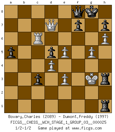 Last move : 1/2-1/2 2022 May 19 18:17:39 [Event "FICGS__CHESS__WCH_STAGE_1_GROUP_03__000025"] [Site "FICGS"] [Date "2022.03.14"] [Round "1"] [White "Bovary,Charles"] [Black "Dumont,Freddy"] [Result "1/2-1/2"] [WhiteElo "2089"] [BlackElo "1997"] 1.d4 Nf6 2.c4 c6 3.Bf4 d5 4.e3 e6 5.Nf3 Bd6 6.Bxd6 Qxd6 7.Nc3 O-O 8.Rc1 Nbd7 9.cxd5 exd5 10.Bd3 Re8 11.O-O Ne4 12.Qc2 Ndf6 13.Ne5 Nxc3 14.bxc3 c5 15.Qe2 c4 16.Bc2 b5 17.f3 a5 18.g4 Nd7 19.f4 Rb8 20.g5 Nxe5 21.fxe5 Qe7 22.Rf6 b4 23.Rcf1 Be6 24.cxb4 Rxb4 25.h4 Reb8 26.Qh5 g6 27.Qd1 Rb2 28.R1f2 Kg7 29.Kg2 Rxa2 30.h5 R8b2 31.Kg3 Bf5 32.R2xf5 gxf5 33.h6+ Kg8 34.Bxf5 Rg2+ 35.Kh4 Rh2+ 36.Bh3 Rae2 37.Rb6 Qf8 38.Qg1 c3 39.Qg3 Rb2 40.Rc6 Rh1 41.Qg4 Rbh2 42.Qd7 Rxh3+ 43.Kg4 Rh4+ 44.Kg3 R4h3+ 45.Kf4 Rh4+ 46.Kg3 R4h3+ 47.Kg4 Rh4+ 48.Kg3 R4h3+ 1/2-1/2 Queen's pawn game Kingside Castling by player Black (move 7) Kingside Castling by player White (move 11) This chess game ended in a draw. Follow this game move after move (download)There are two classes of men; those who are content to yield to circumstances and who play whist; those who aim to control circumstances, and who play Chess. (Mortimer Collins) Strategie ist, wie man ein Mädchen auf den Rücksitz bekommt. Taktik ist, was man tut, wenn man dann dort ist. (Anonymous) Entre mas años cumplo, mas valoro los Peones. (Keres) Soyez une menace à chaque fois que vous vous asseyez pour jouer. (Ken Smith) Chess is everything: art, science and sport. (Anatoly Karpov)