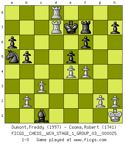 Last move : 1-0 2022 June 2 12:16:24 [Event "FICGS__CHESS__WCH_STAGE_1_GROUP_03__000025"] [Site "FICGS"] [Date "2022.03.14"] [Round "1"] [White "Dumont,Freddy"] [Black "Csoma,Robert"] [Result "1-0"] [WhiteElo "1997"] [BlackElo "1741"] 1.e4 c5 2.Nf3 d6 3.d4 cxd4 4.Nxd4 Nf6 5.Nc3 e6 6.Be3 Be7 7.Be2 O-O 8.O-O a6 9.a4 Bd7 10.a5 Nc6 11.Nb3 Rc8 12.f4 Kh8 13.Bf3 Kg8 14.Na4 Nb4 15.c3 Bxa4 16.Rxa4 Nc6 17.Kh1 Kh8 18.Ra1 Kg8 19.Bb6 Qe8 20.Nd2 Bd8 21.Nc4 Bxb6 22.Nxd6 Rd8 23.Nxe8 Rxd1 24.Nxf6+ gxf6 25.Raxd1 Nxa5 26.Rd7 Be3 27.Bh5 b5 28.Rf3 Bc1 29.Bxf7+ Rxf7 30.Rg3+ Kf8 31.Rd8+ Ke7 32.Rgd3 e5 33.R3d7+ 1-0 Sicilian : Scheveningen variation Kingside Castling by player Black (move 7) Kingside Castling by player White (move 8) Player White won this chess game. Follow this game move after move (download)Chess is a fairy tale of 1001 blunders. (Savielly Tartakower) Wenn Du einsam bist, wenn Du Dich in der Welt wie ein Fremder fühlst, spiele Schach. Das wird Deinen Geist erheben und Dein Ratgeber im Kampf sein. (Aristoteles) Siempre es mucho mejor sacrificar las piezas de tu oponente. (Savielly Tartakover) Votre seul travail dans les ouvertures est d'obtenir un milieu de partie jouable. (Lajos Portish) Humor is by far the most significant activity of the human brain. (Edward De Bono)