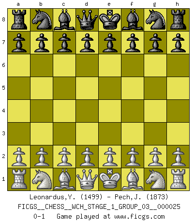 Last move : 0-1 2022 April 14 1:10:43 [Event "FICGS__CHESS__WCH_STAGE_1_GROUP_03__000025"] [Site "FICGS"] [Date "2022.03.14"] [Round "1"] [White "Leonardus,Yohanes"] [Black "Pech,Jaroslav senior"] [Result "0-1"] [WhiteElo "1499"] [BlackElo "1873"] 0-1 This chess game has been lost on time (started : 2022.03.14 20:59:50) Player Black won this chess game. Follow this game move after move (download)No one ever won a game by resigning. (Unknown) Offensichtlich kennt Kasparow nichts anderes als Schach, und ich könnte 500 weitere Spieler dieser Sorte benennen. (Judith Polgar) Con o sin el título, Bobby Fischer fue sin lugar a dudas el mas grande jugador de su época. (Burt Hochberg) Le génie consiste à savoir transgresser les règles au moment opportun. (Teichmann) Gambling is the son of avarice and the father of despair. (French proverb)