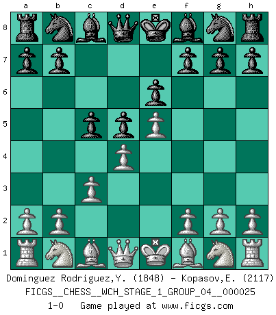 Last move : 1-0 2022 April 25 1:15:29 [Event "FICGS__CHESS__WCH_STAGE_1_GROUP_04__000025"] [Site "FICGS"] [Date "2022.03.14"] [Round "1"] [White "Dominguez Rodriguez,Yosvany"] [Black "Kopasov,Evgeny"] [Result "1-0"] [WhiteElo "1848"] [BlackElo "2117"] 1.e4 e6 2.d4 d5 3.e5 c5 4.c3 1-0 This chess game has been lost on time (started : 2022.03.14 20:59:52) French : Advance variation Player White won this chess game. Follow this game move after move (download)All I want to do, ever, is just play Chess. (Bobby Fischer) Nach Morphy wurde nichts neues mehr in der Behandlung offener Positionen gefunden. (Mikhail Moiseyevich Botvinik) Me siento como si fuera una pieza en una partida de Ajedrez, cuando mi oponente me indica: esa pieza no puede ser movida. (Soren Kierkegaard) Nous sommes les pions de la mystérieuse partie d'Echecs jouée par Dieu. Il nous déplace, nous arrête, nous pousse encore, puis nous lance un à un dans la boîte du Néant. Epitaphe sur la tombe de David Janowsky (1868-1927). I don't diet. I just don't eat as much as I'd like to. (Linda Evangelista, supermodel)