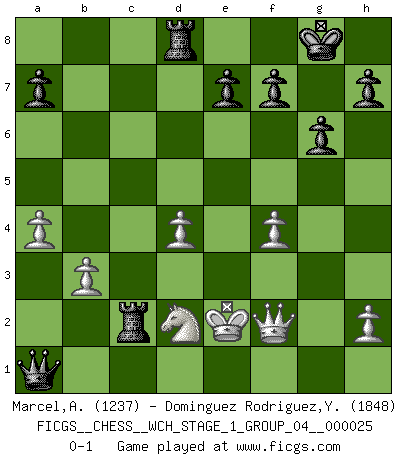 Last move : 0-1 2022 May 5 22:16:53 [Event "FICGS__CHESS__WCH_STAGE_1_GROUP_04__000025"] [Site "FICGS"] [Date "2022.03.14"] [Round "1"] [White "Marcel,Alexis"] [Black "Dominguez Rodriguez,Yosvany"] [Result "0-1"] [WhiteElo "1237"] [BlackElo "1848"] 1.f4 d5 2.Nf3 c5 3.b3 g6 4.Bb2 Nf6 5.e3 Bg7 6.Be2 O-O 7.O-O Nc6 8.a3 d4 9.exd4 cxd4 10.Bb5 Nd5 11.Bxc6 bxc6 12.Bxd4 Bxd4+ 13.Nxd4 Qb6 14.c3 Rd8 15.a4 c5 16.Ne2 Ne3 17.Qc1 Nxf1 18.Kxf1 Bb7 19.d4 Qc6 20.Qe3 Qxg2+ 21.Ke1 cxd4 22.cxd4 Rac8 23.Qg3 Qh1+ 24.Kd2 Ba6 25.Qf2 Bxe2 26.Kxe2 Rc2+ 27.Nd2 Qxa1 0-1 Bird's Opening Kingside Castling by player Black (move 6) Kingside Castling by player White (move 7) Player Black won this chess game. Follow this game move after move (download)Discovered check is the dive bomber of the Chessboard. (Reuben Fine) Obwohl ich alt bin, darf mir niemand den Finger in den Mund stecken, sonst beisse ich. (Wilhelm Steinitz) Yo tuve un dolor de muelas en la primer partida. En el segundo juego, tuve un dolor de cabeza. En el tercero, tuve un ataque de reumatísmo. En la cuarta partida, no me sentía muy bien. ¿Y en el quinto juego? Bueno, ¿que acaso uno tiene que ganar todos los juegos?. (Siegbert Tarrasch) On n'a jamais que l'âge auquel on a commence à jouer aux échecs car après on cesse de vieillir. (Capablanca) Train yourself to let go of everything you fear to lose. (Master Yoda in Star Wars ep.3)