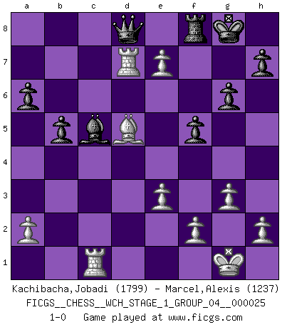 Last move : 1-0 2022 July 13 19:26:29 [Event "FICGS__CHESS__WCH_STAGE_1_GROUP_04__000025"] [Site "FICGS"] [Date "2022.03.14"] [Round "1"] [White "Kachibacha,Jobadi"] [Black "Marcel,Alexis"] [Result "1-0"] [WhiteElo "1799"] [BlackElo "1237"] 1.d4 f5 2.c4 Nf6 3.Nc3 g6 4.g3 Bg7 5.Bg2 O-O 6.Nf3 d6 7.O-O a6 8.Be3 Qe8 9.Nd5 Nxd5 10.cxd5 Nd7 11.Qb3 b5 12.Rac1 Qd8 13.Ng5 Nb6 14.Ne6 Bxe6 15.dxe6 Rb8 16.Rc6 d5 17.Bf4 Bxd4 18.e3 Qe8 19.Qc2 Bf6 20.Bxc7 Rb7 21.Bxb6 Bxb2 22.Bxd5 Bf6 23.Bc7 Ra7 24.Rc1 Rxc7 25.Rxc7 Qd8 26.Qc5 Be5 27.Rxe7 Bd6 28.Rd7 Bxc5 29.e7 1-0 Dutch with c4 & Nc3 Kingside Castling by player Black (move 5) Kingside Castling by player White (move 7) Player White won this chess game. Follow this game move after move (download)In order to improve your game, you must study the endgame before everything else, for whereas the endings can be studied and mastered by themselves, the middle game and the opening must be studied in relation to the endgame. (Jose Raul Capablanca) Wenn es im Universum noch irgendwo intelligente Lebewesen gibt, dann kennen sie Go. (Emanuel Lasker) Bobby Fischer es el mas grande genio de Ajedrez de todos los tiempos. (Alexander Kotov) Je ne crois pas en la psychologie, je crois aux bons coups. (Robert Fischer) He who is a good ruler must first have been ruled. (Aristotle)