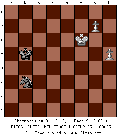 Last move : 1-0 2022 July 22 3:44:34 [Event "FICGS__CHESS__WCH_STAGE_1_GROUP_05__000025"] [Site "FICGS"] [Date "2022.03.14"] [Round "1"] [White "Chronopoulos,Antonis"] [Black "Pech,Stepan"] [Result "1-0"] [WhiteElo "2116"] [BlackElo "1821"] 1.d4 Nf6 2.c4 e6 3.Nf3 d5 4.Nc3 c6 5.e3 Nbd7 6.Qc2 Bd6 7.Bd3 O-O 8.O-O dxc4 9.Bxc4 b5 10.Be2 Bb7 11.Rd1 Qc7 12.h3 a6 13.e4 e5 14.Bg5 exd4 15.Rxd4 c5 16.Rd2 Bf4 17.Bxf4 Qxf4 18.Rad1 Qc7 19.a4 b4 20.Nd5 Bxd5 21.exd5 Qd6 22.a5 Rfe8 23.Bf1 g6 24.Re2 Rxe2 25.Qxe2 Re8 26.Qd3 Nb8 27.Nd2 Qxd5 28.Qxd5 Nxd5 29.Nb3 Ne7 30.Nxc5 Nec6 31.Nb3 Rd8 32.Rxd8+ Nxd8 33.f4 Ne6 34.g3 Kg7 35.Kf2 Kf6 36.Ke3 Ke7 37.g4 Kd6 38.Bc4 f6 39.h4 h6 40.Kf3 g5 41.h5 gxf4 42.Ke4 Nd7 43.Be2 Ne5 44.Bxa6 f3 45.Kf5 Ng5 46.Bf1 f2 47.a6 Kc7 48.Nd4 Kb6 49.Nc2 Ngf3 50.Nxb4 Nd4+ 51.Ke4 Nb5 52.Nd5+ Kxa6 53.Nxf6 Nf7 54.Kf3 Ka5 55.Bxb5 Kxb5 56.Kxf2 Kc6 57.Kg3 Kd6 58.Ng8 Ke5 59.b4 Kd5 60.b5 Kc5 61.Nxh6 Nxh6 62.g5 Nf5+ 63.Kf4 Ne7 64.Ke5 Kxb5 65.Ke6 Nc6 66.g6 Nd4+ 67.Kf6 Nb3 68.g7 1-0 Queen's pawn game Kingside Castling by player Black (move 7) Kingside Castling by player White (move 8) 10 pieces endgame at move 55 : White KBNPPP , Black KNPP WHITE : King + 1 Bishop 1 Knight 3 Pawns BLACK : King + 1 Knight 2 Pawns 9 pieces endgame at move 55 : White KNPPP , Black KNPP WHITE : King + 1 Knight 3 Pawns BLACK : King + 1 Knight 2 Pawns 8 pieces endgame at move 56 : White KNPPP , Black KNP WHITE : King + 1 Knight 3 Pawns BLACK : King + 1 Knight 1 Pawn 7 pieces endgame at move 61 : White KNPPP , Black KN WHITE : King + 1 Knight 3 Pawns BLACK : King + 1 Knight 6 pieces endgame at move 61 : White KPPP , Black KN WHITE : King + 3 Pawns BLACK : King + 1 Knight 5 pieces endgame at move 64 : White KPP , Black KN WHITE : King + 2 Pawns BLACK : King + 1 Knight Player White won this chess game. Follow this game move after move (download)For surely of all the drugs in the world, Chess must be the most permanently pleasurable. (Assiac) Schon mancher Spieler hat aufgegeben, um zu vermeiden, daß er eine Figur verliert. (Savielly Grigorievitsch Tartakower) Es el objetivo de la escuela moderna no tratar cada posición de acuerdo a una regla general, sino de acuerdo al principio inherente en la posición. (Richard Reti) Plusieurs personnes se sont demandées comment Tal faisait pour gagner... En fait, c'est très simple ! Il met ses pièces au centre de l'échiquier et les sacrifie quelque part ! (David Bronstein) Memory is a crazy woman that hoards colored rags and throws away food. (Austin O'Malley)