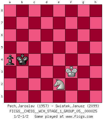 Last move : 1/2-1/2 2022 August 13 21:30:20 [Event "FICGS__CHESS__WCH_STAGE_1_GROUP_05__000025"] [Site "FICGS"] [Date "2022.03.14"] [Round "1"] [White "Pech,Jaroslav"] [Black "Swiatek,Janusz"] [Result "1/2-1/2"] [WhiteElo "1957"] [BlackElo "2099"] 1.e4 c5 2.Nf3 Nc6 3.d4 cxd4 4.Nxd4 Nf6 5.Nc3 d6 6.Bg5 e6 7.Qd2 Be7 8.O-O-O O-O 9.f4 Nxd4 10.Qxd4 h6 11.Bh4 Qa5 12.Bc4 e5 13.fxe5 dxe5 14.Qd3 Bg4 15.Rdf1 Rac8 16.Bxf6 Bxf6 17.Kb1 Qc5 18.Bd5 Be6 19.Bxb7 Bc4 20.Qg3 Bxf1 21.Bxc8 Bxg2 22.Qxg2 Rxc8 23.Nd5 Bh4 24.c3 Rb8 25.b3 a5 26.Qh3 Qf2 27.Qf1 Qc5 28.Qf3 g6 29.Rf1 Rb7 30.Qd3 Qa3 31.Qc2 Kg7 32.Qe2 h5 33.Qc4 Be7 34.Rg1 Qc5 35.Qxc5 Bxc5 36.Rf1 Rd7 37.c4 Rd6 38.Kc2 g5 39.Ne7 Rf6 40.Nf5+ Kg6 41.h3 g4 42.Kd3 Rb6 43.hxg4 hxg4 44.Ne3 Rd6+ 45.Nd5 Kg7 46.Ke2 Rh6 47.Rf5 Bd4 48.Rg5+ Rg6 49.Rxg6+ Kxg6 50.a3 Kg5 51.Kf1 f5 52.exf5 Kxf5 53.b4 a4 54.Kg2 e4 55.c5 e3 56.c6 Ke6 57.Kf1 g3 58.Nf4+ Kd6 59.c7 Kd7 60.Ng2 Kxc7 61.Ke2 Kc6 62.Nxe3 Kb5 63.Nf5 Be5 64.Kf3 Kc4 65.Nxg3 Bd6 66.Ne2 Bxb4 67.axb4 Kxb4 1/2-1/2 Sicilian defense Queenside Castling by player White (move 8) Kingside Castling by player Black (move 8) 10 pieces endgame at move 52 : White KNPPP , Black KBPPP WHITE : King + 1 Knight 3 Pawns BLACK : King + 1 Bishop 3 Pawns 9 pieces endgame at move 60 : White KNPP , Black KBPPP WHITE : King + 1 Knight 2 Pawns BLACK : King + 1 Bishop 3 Pawns 8 pieces endgame at move 62 : White KNPP , Black KBPP WHITE : King + 1 Knight 2 Pawns BLACK : King + 1 Bishop 2 Pawns 7 pieces endgame at move 65 : White KNPP , Black KBP WHITE : King + 1 Knight 2 Pawns BLACK : King + 1 Bishop 1 Pawn 6 pieces endgame at move 66 : White KNP , Black KBP WHITE : King + 1 Knight 1 Pawn BLACK : King + 1 Bishop 1 Pawn 5 pieces endgame at move 67 : White KNP , Black KP WHITE : King + 1 Knight 1 Pawn BLACK : King + 1 Pawn 4 pieces endgame at move 67 : White KN , Black KP WHITE : King + 1 Knight BLACK : King + 1 Pawn This chess game ended in a draw. Follow this game move after move (download)Blessed be the memory of him who gave the world this immortal game. (A. G. Gardiner) Ich verstehe den Grund nicht, warum die Aufteilung in Frauen und Männer überhaupt im Schach besteht. (Judith Polgar) Bobby es la celebridad menos entendida y malinterpretada que camina el la faz de esta tierra. (Yasser Seirawan) Si je n'étais pas joueur d'échecs, je serais le meilleur dans quelque chose d'autre. (Anatoli Karpov) The message for business people contemplating their place in the cyberspace is simple and direct: get linked or get lost. (Vic Sussman and Kenan Pollack)