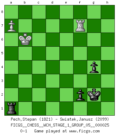Last move : 0-1 2022 August 19 2:59:40 [Event "FICGS__CHESS__WCH_STAGE_1_GROUP_05__000025"] [Site "FICGS"] [Date "2022.03.14"] [Round "1"] [White "Pech,Stepan"] [Black "Swiatek,Janusz"] [Result "0-1"] [WhiteElo "1821"] [BlackElo "2099"] 1.e4 c6 2.d4 d5 3.Nc3 dxe4 4.Nxe4 Nf6 5.Nxf6+ exf6 6.c3 Bd6 7.Bd3 O-O 8.Ne2 c5 9.Qc2 h6 10.Be3 Qc7 11.O-O-O c4 12.Be4 Re8 13.Kb1 Nc6 14.d5 Ne5 15.h3 b5 16.Nd4 Bd7 17.Rhe1 Rac8 18.Bh7+ Kh8 19.f4 Nd3 20.Bxd3 cxd3 21.Qxd3 b4 22.cxb4 Bxb4 23.Re2 Bc5 24.g4 f5 25.Rc1 Qb8 26.Rec2 Bxd4 27.Qxd4 Rxc2 28.Rxc2 fxg4 29.hxg4 Bxg4 30.Rg2 Bf5+ 31.Ka1 f6 32.b3 a5 33.Qa7 Qxa7 34.Bxa7 Re1+ 35.Kb2 Rd1 36.Kc3 Rxd5 37.Rd2 Rb5 38.a4 Rb4 39.Rd5 Be6 40.Rb5 Rxf4 41.Bb6 g5 42.Bxa5 h5 43.Bc7 Rf3+ 44.Kc2 h4 45.a5 Rf2+ 46.Kd3 h3 47.a6 Ra2 48.Rb6 Bf5+ 49.Kd4 Kg7 50.b4 Rd2+ 51.Ke3 h2 52.Bxh2 Rxh2 53.Rb7+ Kg6 54.a7 Rh3+ 55.Kd4 Rd3+ 56.Kc5 Ra3 57.b5 Be4 58.Re7 Bf3 59.b6 g4 60.Re8 f5 61.Kb4 Ra1 62.Kc5 Kg5 63.Re3 Ba8 64.Rb3 f4 65.b7 Bxb7 66.Rxb7 f3 67.Rg7+ Kh4 68.Kb6 f2 69.Rh7+ Kg3 70.Rf7 Kg2 0-1 Caro-Kann : Tartakower (Nimzovich) variation Kingside Castling by player Black (move 7) Queenside Castling by player White (move 11) 10 pieces endgame at move 52 : White KRBPP , Black KRBPP WHITE : King + 1 Rook 1 Bishop 2 Pawns BLACK : King + 1 Rook 1 Bishop 2 Pawns 9 pieces endgame at move 52 : White KRPP , Black KRBPP WHITE : King + 1 Rook 2 Pawns BLACK : King + 1 Rook 1 Bishop 2 Pawns 8 pieces endgame at move 65 : White KRP , Black KRBPP WHITE : King + 1 Rook 1 Pawn BLACK : King + 1 Rook 1 Bishop 2 Pawns 7 pieces endgame at move 66 : White KRP , Black KRPP WHITE : King + 1 Rook 1 Pawn BLACK : King + 1 Rook 2 Pawns Player Black won this chess game. Follow this game move after move (download)The essence of Chess is thinking about what Chess is. (David Bronstein) Ich habe Kasparov in Rente geschickt. (Veselin Topalov) Botvinnik trató de alejar el misterio referente al Ajedrez, siempre relacionandolo a situaciones de la vida diaria. Solía llamar al Ajedrez un problema inexacto típico, similar a aquellos en que la gente tiene siempre que resolver a cada día. (Garry Kasparov) Une platitude souvent récitée à propos des Echecs est qu'une des choses les plus difficiles à réaliser est de gagner une position gagnante. Cela ne manque pas de sens mais, pour ma part, j'ai toujours trouvé plus difficile de gagner une position perdante. (Tim Krabbe) Luck never made a man wise. (Seneca, Letters to Lucilius)