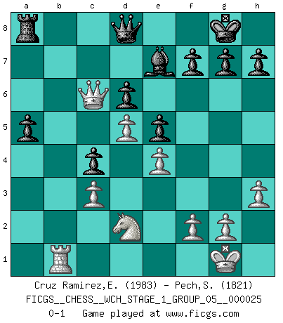 Last move : 0-1 2022 July 13 9:38:39 [Event "FICGS__CHESS__WCH_STAGE_1_GROUP_05__000025"] [Site "FICGS"] [Date "2022.03.14"] [Round "1"] [White "Cruz Ramirez,Eliecer"] [Black "Pech,Stepan"] [Result "0-1"] [WhiteElo "1983"] [BlackElo "1821"] 1.e4 e5 2.Nf3 Nc6 3.Bb5 a6 4.Ba4 Nf6 5.O-O Be7 6.Re1 b5 7.Bb3 d6 8.c3 O-O 9.h3 Na5 10.Bc2 c5 11.d4 Qc7 12.d5 Bd7 13.b3 Rfb8 14.Be3 c4 15.b4 Nb7 16.a4 bxa4 17.Na3 a5 18.b5 Nc5 19.Bxc5 Qxc5 20.Bxa4 Ne8 21.Nd2 Nc7 22.b6 Nb5 23.Nxb5 Bxb5 24.Bxb5 Qxb5 25.Rb1 Qc5 26.Qa4 Rxb6 27.Rxb6 Qxb6 28.Rb1 Qc7 29.Qc6 Qd8 0-1 This chess game has been lost on time (started : 2022.03.14 20:59:54) Ruy Lopez : Closed Kingside Castling by player White (move 5) Kingside Castling by player Black (move 8) Player Black won this chess game. Follow this game move after move (download)Many have become Chess Masters, no one has become the Master of Chess. (Siegbert Tarrasch) Pläne sind die Träume des Verständigen. (Ernst Freiherr von Feuchtersleben) Yo tuve un dolor de muelas en la primer partida. En el segundo juego, tuve un dolor de cabeza. En el tercero, tuve un ataque de reumatísmo. En la cuarta partida, no me sentía muy bien. ¿Y en el quinto juego? Bueno, ¿que acaso uno tiene que ganar todos los juegos?. (Siegbert Tarrasch) Ce qui est bien, c'est d'avoir tout un tas de pièces en prise : l'adversaire ne peut en prendre qu'une à la fois. Cité par Thierry Audin. Methinks King Thibault should dub Marius Zubac a knight of the square board... I mean table, henceforth addressing him as Sir Marius, and bestow on him a suitable land from the kingdom of FICGS & marry him off to a worthy, fair maiden, lest he slice our heads with his mighty sword in his wrath. (Dinesh De Silva)