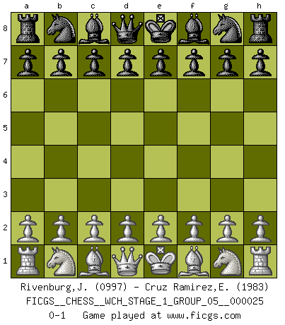 Last move : 0-1 2022 April 14 1:10:43 [Event "FICGS__CHESS__WCH_STAGE_1_GROUP_05__000025"] [Site "FICGS"] [Date "2022.03.14"] [Round "1"] [White "Rivenburg,John"] [Black "Cruz Ramirez,Eliecer"] [Result "0-1"] [WhiteElo "0997"] [BlackElo "1983"] 0-1 This chess game has been lost on time (started : 2022.03.14 20:59:54) Player Black won this chess game. Follow this game move after move (download)If one piece is badly posted, the whole game is bad. (Tarrasch) Frage: Was machen Sie mit den Preisen? Anwort: Ich habe Angst, dass meine Freundin davon neue Kleider kauft. (Loek van Wely) El muchacho (en ese entonces un niño de 12 años llamado Anatoly Karpov) no tiene ni idea de lo que es el Ajedrez y no hay futuro en absoluto para el en esta profesión. (Mikhail Botvinnik) Un journaliste : 'Vous préférez avoir une dame de plus sur l'échiquier ou au lit ?' Boris Spassky : 'Ca dépend de la position.' CHESS, n. f. [echecs, Fr.] A nice and abstruse game, in which two sets of puppets are moved in opposition to each other. (Dr Samuel Johnson, A Dictionary Of The English Language, 1755)