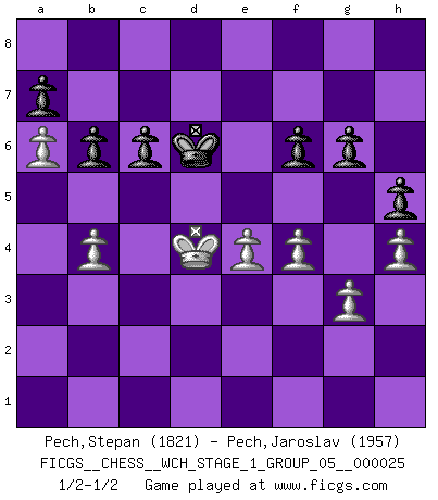 Last move : 1/2-1/2 2022 August 12 21:48:1 [Event "FICGS__CHESS__WCH_STAGE_1_GROUP_05__000025"] [Site "FICGS"] [Date "2022.03.14"] [Round "1"] [White "Pech,Stepan"] [Black "Pech,Jaroslav"] [Result "1/2-1/2"] [WhiteElo "1821"] [BlackElo "1957"] 1.d4 d5 2.c4 e6 3.Nc3 Nf6 4.Bg5 Be7 5.e3 O-O 6.Nf3 Nbd7 7.Rc1 c6 8.Bd3 dxc4 9.Bxc4 Nd5 10.Bxe7 Qxe7 11.O-O Nxc3 12.Rxc3 e5 13.dxe5 Nxe5 14.Nxe5 Qxe5 15.f4 Qe4 16.Qe2 Bf5 17.Bd3 Qd5 18.e4 Qd4+ 19.Qf2 Qxf2+ 20.Kxf2 Bd7 21.Rd1 Rfd8 22.Bc4 Be8 23.Rxd8 Rxd8 24.Rd3 Rxd3 25.Bxd3 f6 26.Bc4+ Bf7 27.Bxf7+ Kxf7 28.b4 Ke6 29.Ke3 b6 30.Kd4 h5 31.h4 Kd6 32.a4 Kd7 33.g3 Ke7 34.Kd3 Ke6 35.Kc4 Kd6 36.a5 Ke6 37.Kd3 Kd7 38.Kc3 Kc7 39.a6 Kd6 40.Kd4 Ke6 41.Kd3 Kd7 42.Kc4 Ke7 43.Kd3 g6 44.Kc4 Kd6 45.Kd4 1/2-1/2 QGD : Orthodox defense Kingside Castling by player Black (move 5) Kingside Castling by player White (move 11) This chess game ended in a draw. Follow this game move after move (download)Half the variations which are calculated in a tournament game turn out to be completely superfluous. Unfortunately, no one knows in advance which half. (Jan Tinman) Eine Person mit durchschnittlichem IQ kann etwa eine ELO von 2000 erreichen. (Jonathan Levitt) Siempre es mejor sacrificar los hombres de tu oponente. (Savielly Tartakower) Les échecs sont un jeu par leur forme, un art par leur essence et une science par sa difficulté d'acquisition. Ils peuvent vous procurer autant de plaisir qu'un bon livre ou une belle musique, mais vous n'aurez une réelle joie que si vous arrivez à bien jouer. (Tigran Petrosian) Wisdom is the reward you get for a lifetime of listening when you'd have preferred to talk. (Doug Larson)