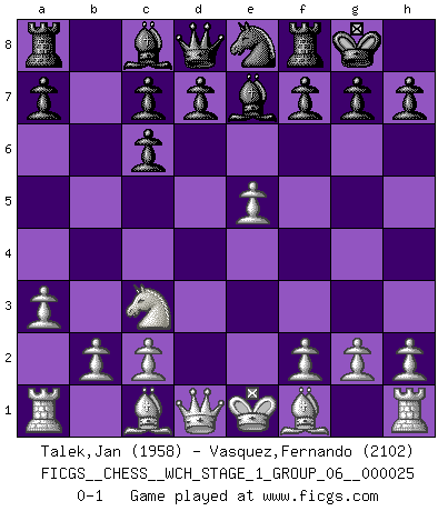 Last move : 0-1 2022 May 8 5:48:39 [Event "FICGS__CHESS__WCH_STAGE_1_GROUP_06__000025"] [Site "FICGS"] [Date "2022.03.14"] [Round "1"] [White "Talek,Jan"] [Black "Vasquez,Fernando"] [Result "0-1"] [WhiteElo "1958"] [BlackElo "2102"] 1.a3 e5 2.e4 Nf6 3.Nc3 Nc6 4.Nf3 Be7 5.d4 exd4 6.Nxd4 O-O 7.Nxc6 bxc6 8.e5 Ne8 0-1 This chess game has been lost on time (started : 2022.03.14 20:59:56) Anderssen's Opening Kingside Castling by player Black (move 6) Player Black won this chess game. Follow this game move after move (download)War is the child of passion, passion is the child of narcissism and narcissism is the child. (...) Another game ? (Thibault de Vassal) Ich habe die besten Aussichten, den ersten Preis zu gewinnen - denn jeder muss gegen Steinitz spielen, nur ich nicht! (Wilhelm Steinitz) El estómago es una parte esencial del maestro de Ajedrez. (Bent Larsen) L'attaque fait le spectacle, la défense gagne les matchs. (Dicton footballistique) There is a very easy way to return from a casino with a small fortune : go there with a large one. (Jack Yelton)