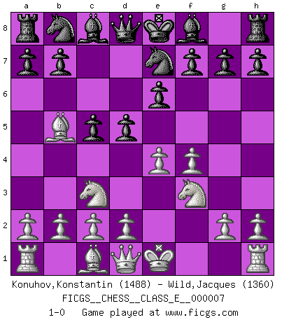 Last move : 1-0 2006 September 4 19:19:38 [Event "FICGS__CHESS__CLASS_E__000007"] [Site "FICGS"] [Date "2006.06.27"] [Round "1"] [White "Konuhov,Konstantin"] [Black "Wild,Jacques"] [Result "1-0"] [WhiteElo "1488"] [BlackElo "1360"] 1.e4 c5 2.f4 e6 3.Nc3 Ne7 4.Nf3 d5 5.Bb5 1-0 This chess game has been lost on time (started : 2006.06.27 19:4:46) Sicilian : Grand Prix attack Player White won this chess game. Follow this game move after move (download)You must take your opponent into a deep dark forest where 2+2=5, and the path leading out is only wide enough for one. (Mikhail Tal) Versuche, dich von der Sklaverei der Eröffnungsvarianten zu befreien. Stattdessen soll man gewisse Typenpositionen erlernen, die man eingehend analysiert. (Aaron Nimzowitsch) Sin errores no puede haber brillantez. (Emanuel Lasker) Assurément je connaissais par expérience le mystérieux attrait de ce jeu royal, le seul entre tous les jeux inventés par les hommes qui échappe souverainement à la tyrannie du hasard, le seul où l'on ne doive sa victoire qu'à son intelligence ou plutôt à une certaine forme d'intelligence. Mais n'est-ce pas déjà le limiter injurieusement que d'appeler les échecs un jeu ? N'est-ce pas une science, un art ou quelque chose qui, comme le cercueil de Mahomet entre ciel et terre, est suspendu entre l'un et l'autre, et qui réunit un nombre incroyable de contraires ? [...] C'est une pensée qui ne mène à rien, une mathématique qui n'établit rien, un art qui ne laisse pas d'uvre, une architecture sans matière; et il l'a prouvé néanmoins qu'il était plus durable, à sa manière, que les livres ou que tout autre monument, ce jeu unique qui appartient à tous les peuples et à tous les temps, et dont personne ne sait quel dieu en fit don à la terre pour tuer l'ennui, pour aiguiser l'esprit et stimuler l'âme. Où commence-t-il, où finit-il ? (Stefan Zweig) Are you threatening me, Master Jedi ? (Chancellor Palpatine in Star Wars ep.3)