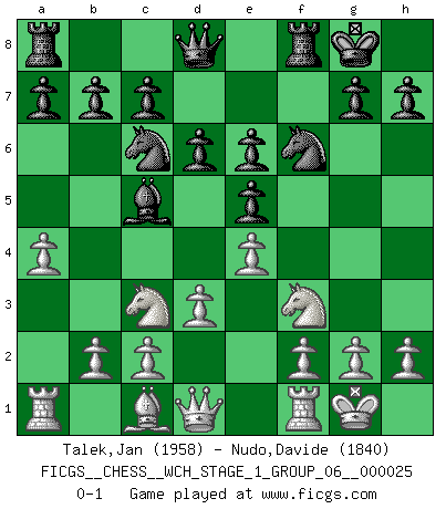 Last move : 0-1 2022 May 11 15:31:57 [Event "FICGS__CHESS__WCH_STAGE_1_GROUP_06__000025"] [Site "FICGS"] [Date "2022.03.14"] [Round "1"] [White "Talek,Jan"] [Black "Nudo,Davide"] [Result "0-1"] [WhiteElo "1958"] [BlackElo "1840"] 1.a4 e5 2.e4 Nf6 3.Nc3 Bc5 4.Bc4 d6 5.Nf3 Be6 6.Bxe6 fxe6 7.d3 Nc6 8.O-O O-O 0-1 This chess game has been lost on time (started : 2022.03.14 20:59:56) Ware (Meadow Hay) Opening Kingside Castling by player White (move 8) Kingside Castling by player Black (move 8) Player Black won this chess game. Follow this game move after move (download)By this measure (on the gap between Fischer & his contemporaries), I consider him the greatest world champion. (Garry Kasparov) Ich verstehe Aljechins Kombinationen ganz gut; aber woher er diese Angriffschancen bekommt und wie er die Eröffnung behandelt das ist für mich ein Buch mit sieben Siegeln. (Rudolf Spielmann) Observen a Garry Kasparov. Después de una derrota, invariablemente el gana la próxima partida. Prácticamente hace pedazos a su siguiente oponente. Eso es algo que tenemos que aprender a lograr. (Maurice Ashley) Pour moi, les échecs ne sont pas un jeu mais un art. (Alexandre Alekhine) A woman without a man is like a fish without a bicycle. (Gloria Steinem)