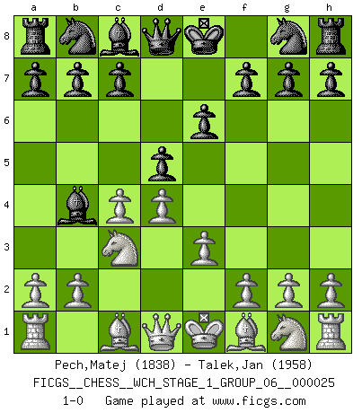Last move : 1-0 2022 May 19 6:14:54 [Event "FICGS__CHESS__WCH_STAGE_1_GROUP_06__000025"] [Site "FICGS"] [Date "2022.03.14"] [Round "1"] [White "Pech,Matej"] [Black "Talek,Jan"] [Result "1-0"] [WhiteElo "1838"] [BlackElo "1958"] 1.d4 e6 2.c4 d5 3.Nc3 Bb4 4.e3 1-0 This chess game has been lost on time (started : 2022.03.14 20:59:56) Queen's pawn Player White won this chess game. Follow this game move after move (download)No one ever won a game by resigning. (Unknown) Die FIDE ist dabei in die Hände der russischen Mafia zu fallen. (Larry Evans) A través de las casillas del tablero, los Indios explican el movimiento del tiempo y la edad, las influencias mas altas que controlan el mundo y los lazos que vinculan al Ajedrez con el alma humana. (Al-Masudi) Les Echecs, c'est l'art de la guerre sans les charniers, c'est la résurrection des morts tombés au champ d'honneur, l'espoir perpétuel, la suprématie de l'intelligence sur la force, la culture de l'esprit. (F. Szpiner) You can't play chess if you're groggy from pills. (Anatoly Karpov)