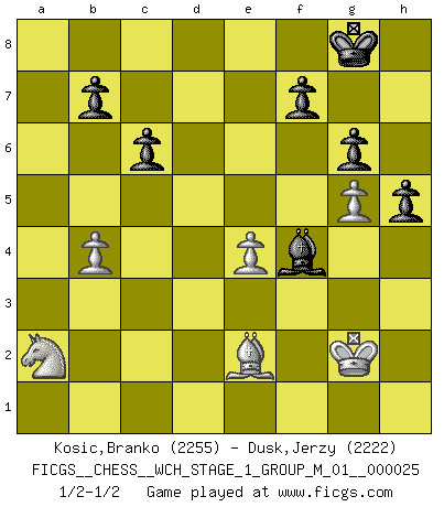 Last move : 1/2-1/2 2022 June 15 13:39:40 [Event "FICGS__CHESS__WCH_STAGE_1_GROUP_M_01__000025"] [Site "FICGS"] [Date "2022.03.14"] [Round "1"] [White "Kosic,Branko"] [Black "Dusk,Jerzy"] [Result "1/2-1/2"] [WhiteElo "2255"] [BlackElo "2222"] 1.c4 e5 2.Nc3 Nf6 3.Nf3 Nc6 4.e4 Bb4 5.d3 d6 6.a3 Bc5 7.b4 Bb6 8.Na4 Bd4 9.Rb1 Bg4 10.Be2 Bxf3 11.Bxf3 a6 12.Bd2 Ba7 13.Nc3 Nd4 14.O-O c6 15.g3 h5 16.h4 Qd7 17.Be3 O-O 18.Bxd4 Bxd4 19.Qd2 Bb6 20.c5 Bc7 21.Kg2 Rad8 22.Qe3 g6 23.Rfd1 Rfe8 24.d4 exd4 25.Qxd4 Qe7 26.cxd6 Bxd6 27.Qe3 Bc7 28.Rxd8 Rxd8 29.Re1 Nd7 30.Rd1 a5 31.Qg5 Qxg5 32.hxg5 Nf8 33.Be2 Rxd1 34.Bxd1 Bd6 35.Na2 axb4 36.axb4 Ne6 37.f4 Nxf4+ 38.gxf4 Bxf4 39.Be2 1/2-1/2 English Opening Kingside Castling by player White (move 14) Kingside Castling by player Black (move 17) This chess game ended in a draw. Follow this game move after move (download)Chess opens and enriches your mind. (Saudin Robovic) Fischer: 'Remis!?' Uhlmann: 'Aber es muss doch dreimal Zugwiederholung sein!' Fischer: 'Sie nehmen das Remis an, wie ich es sage, sonst spiele ich weiter und werde Sie dann schlagen!' (Robert James Fischer) Jugadores de primera clase pierden en contra de jugadores de segunda clase porque los jugadores de segunda clase a veces juegan una partida de primer clase. (Siegbert Tarrasch) Mais l'homme est une créature légère et illogique : semblable au joueur d'échecs, il n'aime que le processus du but à atteindre, non le but lui-même. (Dostoïevsky) Luck is the residue of design. (John Milton)