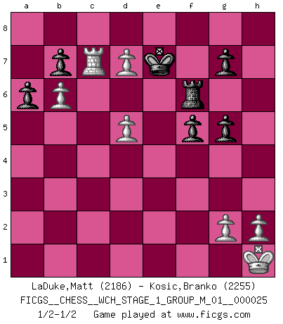 Last move : 1/2-1/2 2022 June 5 13:42:38 [Event "FICGS__CHESS__WCH_STAGE_1_GROUP_M_01__000025"] [Site "FICGS"] [Date "2022.03.14"] [Round "1"] [White "LaDuke,Matt"] [Black "Kosic,Branko"] [Result "1/2-1/2"] [WhiteElo "2186"] [BlackElo "2255"] 1.e4 c5 2.Nf3 Nc6 3.d4 cxd4 4.Nxd4 Nf6 5.Nc3 e5 6.Ndb5 d6 7.Nd5 Nxd5 8.exd5 Nb8 9.a4 Be7 10.Be2 O-O 11.Bd2 Bf5 12.O-O Nd7 13.a5 a6 14.Na3 Bg6 15.Bb4 Rc8 16.Nc4 Nc5 17.Bh5 f5 18.Bxg6 hxg6 19.Qe2 Qe8 20.Nb6 Rc7 21.Bxc5 Rxc5 22.c4 g5 23.b4 Rc7 24.f3 Bf6 25.Rad1 e4 26.c5 exf3 27.Qxf3 Qb5 28.cxd6 Rc3 29.Qf2 Rd3 30.d7 Rxd1 31.Rxd1 Qxb4 32.Qe1 Bd4+ 33.Kh1 Qxe1+ 34.Rxe1 Bxb6 35.axb6 Kf7 36.Rc1 Ke7 37.Rc7 Rf6 1/2-1/2 Sicilian : Pelikan (Lasker/Sveshnikov) variation Kingside Castling by player Black (move 10) Kingside Castling by player White (move 12) This chess game ended in a draw. Follow this game move after move (download)It is not a move, even the best move that you must seek, but a realizable plan. (Eugene Znosko-Borovsky) Dass jemand wie Surab Asmaiparaschwili, der selbst Elopunkte gekauft hat , Vize-Präsident der Fide werden konnte, sagt schon einges über den Zustand dieser Organisation aus. (Joel Lautier) Una de estas pequeñas movidas modestas pudieran ser mas molestas a tu oponente que la amenaza mas grande. (Siegbert Tarrasch) L'action d'une oeuvre littéraire se déroule sur un champ de bataille. Les masques et les types du drame moderne correspondent aux pièces du jeu d'échecs. L'intrigue correspond aux coups et aux gambits, c'est à dire aux techniques du jeu telles qu'utilisées et interprétées par les joueurs. Les tactiques et les péripéties [mouvements] correspondent aux coups exécutés par l'adversaire. (Viktor Shklovsky) A cynic is a man who knows the price of everything but the value of nothing. (Oscar Wilde)