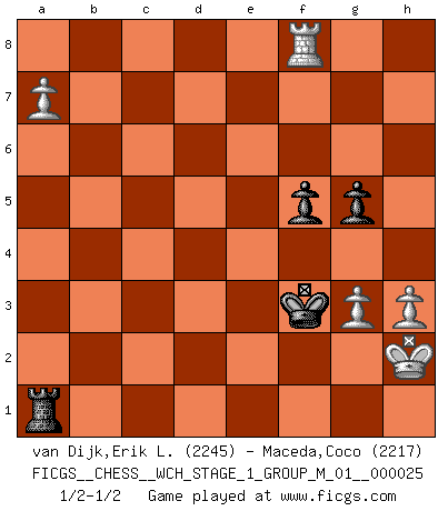 Last move : 1/2-1/2 2022 August 15 0:33:24 [Event "FICGS__CHESS__WCH_STAGE_1_GROUP_M_01__000025"] [Site "FICGS"] [Date "2022.03.14"] [Round "1"] [White "van Dijk,Erik L."] [Black "Maceda,Coco"] [Result "1/2-1/2"] [WhiteElo "2245"] [BlackElo "2217"] 1.e4 c5 2.Nf3 d6 3.Bb5+ Bd7 4.Bxd7+ Qxd7 5.c4 Nc6 6.Nc3 Nf6 7.d4 cxd4 8.Nxd4 g6 9.f3 Bg7 10.Be3 O-O 11.O-O a6 12.Qd3 Rab8 13.Nxc6 bxc6 14.b3 Qc7 15.Rad1 Nd7 16.f4 Rbd8 17.Qc2 Nc5 18.f5 Qb7 19.Ne2 a5 20.Bd2 Nd7 21.Kh1 Ra8 22.h3 Qb6 23.Nf4 Ne5 24.Be1 Qc5 25.Nd3 Nxd3 26.Rxd3 Qe5 27.Qe2 Qb2 28.Rd2 Qa3 29.Bh4 Rae8 30.Rb1 Qc5 31.Bf2 Qb4 32.Rd3 Be5 33.a4 Rb8 34.Be3 f6 35.Bh6 Rf7 36.Qg4 Kh8 37.fxg6 hxg6 38.Bd2 Qc5 39.Be3 Qa3 40.c5 Kg7 41.Qd1 Qb4 42.cxd6 exd6 43.Bd4 Re8 44.Rc1 c5 45.Bxe5 Rxe5 46.Rc4 Qb7 47.Rxd6 Rxe4 48.Rxc5 Qb4 49.Rc1 Re3 50.Rd3 Rfe7 51.Rxe3 Rxe3 52.Rc7+ Kh6 53.Qc1 Qe1+ 54.Qxe1 Rxe1+ 55.Kh2 Re3 56.Ra7 Rxb3 57.Rxa5 Ra3 58.Ra8 Kg5 59.a5 Kf4 60.a6 g5 61.a7 f5 62.g3+ Kf3 63.Rf8 Ra2+ 64.Kg1 Ra1+ 65.Kh2 1/2-1/2 Sicilian : Canal-Sokolsky attack, Sokolsky variation Kingside Castling by player Black (move 10) Kingside Castling by player White (move 11) 10 pieces endgame at move 56 : White KRPPP , Black KRPPP WHITE : King + 1 Rook 3 Pawns BLACK : King + 1 Rook 3 Pawns 9 pieces endgame at move 57 : White KRPPP , Black KRPP WHITE : King + 1 Rook 3 Pawns BLACK : King + 1 Rook 2 Pawns This chess game ended in a draw. Follow this game move after move (download)The most powerful weapon in Chess is to have the next move. (David Bronstein) Warum muß ich gegen diesen IDIOTEN verlieren? (Aaron Nimzowitsch) El Ajedrez te enseña a controlarl la excitación inicial que sientes cuando vez algo que parece bueno y te enseña a pensar objetivamente cuando te encuentras en problemas. (Stanley Kubrick) Echiquier : carré parfait, comme la Jérusalem nouvelle décrite par l'auteur de l'Apocalypse, huit cases sur huit, exaltation du chiffre 4, symbole du cosmos aux quatre horizons... où le noir et le blanc, l'ombre et la lumière, le mal et le bien s'entremêlent et se conjuguent. (Robert Couffignal, Le Gambit du poète) The production of too many useful things results in too many useless people. (Karl Marx)