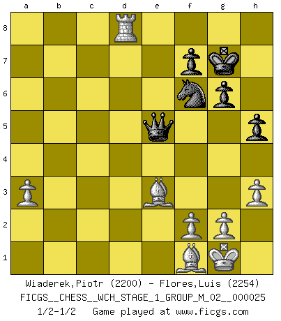 Last move : 1/2-1/2 2022 June 25 14:59:41 [Event "FICGS__CHESS__WCH_STAGE_1_GROUP_M_02__000025"] [Site "FICGS"] [Date "2022.03.14"] [Round "1"] [White "Wiaderek,Piotr"] [Black "Flores,Luis"] [Result "1/2-1/2"] [WhiteElo "2200"] [BlackElo "2254"] 1.d4 d5 2.c4 c6 3.Nf3 Nf6 4.Nc3 e6 5.e3 Nbd7 6.Qc2 Bd6 7.Bd3 O-O 8.O-O dxc4 9.Bxc4 a6 10.e4 e5 11.Rd1 Qc7 12.h3 exd4 13.Nxd4 Re8 14.Be3 b5 15.Bf1 g6 16.Rac1 Bb7 17.Qd2 Rad8 18.Nxc6 Bh2+ 19.Kh1 Bxc6 20.Nd5 Qb7 21.Nxf6+ Nxf6 22.Qxd8 Rxd8 23.Rxd8+ Ne8 24.Kxh2 Qc7+ 25.e5 Qxd8 26.Rxc6 Qa8 27.Rb6 Qe4 28.Rxa6 Nc7 29.Ra7 h5 30.Kg1 Nd5 31.Bc1 Qxe5 32.Rd7 b4 33.a4 bxa3 34.bxa3 Nf6 35.Rd8+ Kg7 36.Be3 1/2-1/2 QGD Slav : 4.Nc3 Kingside Castling by player Black (move 7) Kingside Castling by player White (move 8) This chess game ended in a draw. Follow this game move after move (download)By the beauty of his games, the clarity of his play, and the brilliance of his ideas, Fischer made himself an artist of the same stature as Brahms, Rembrandt, and Shakespeare. (David Levy) Ich verstehe Aljechins Kombinationen ganz gut; aber woher er diese Angriffschancen bekommt und wie er die Eröffnung behandelt das ist für mich ein Buch mit sieben Siegeln. (Rudolf Spielmann) Realmente no sabemos como el juego fue inventado, aunque hay sospechas. Tan pronto como descubramos a los culpables, se los haremos saber. (Bruce Pandolfini) Je crois qu'il existe des manières très spécifiques de jouer efficacement contre une machine. Evidemment, nous n'avons aucune chance en technique pure, parce que l'ordinateur calcule de manière parfaite. Mais lorsque nous faisons appel à notre cerveau, en utilisant l'intuition et la compréhension, alors nous restons beaucoup plus forts. (Anatoli Karpov) If only people were all showed a certain minimum level of niceness; if only people didn't retract verbal draw offers (without draw box ticked) on ficgs; if only people didn't kill; if only people didn't run concentration / extermination camps, if only people didn't drop nuclear bombs on Hiroshima and Nagasaki, and so on - it would be a much more beautiful world. But sadly, things are not so... (Normajean Yates)