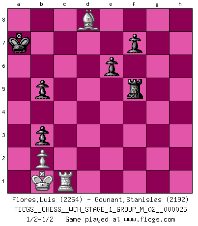 Last move : 1/2-1/2 2022 May 17 21:51:13 [Event "FICGS__CHESS__WCH_STAGE_1_GROUP_M_02__000025"] [Site "FICGS"] [Date "2022.03.14"] [Round "1"] [White "Flores,Luis"] [Black "Gounant,Stanislas"] [Result "1/2-1/2"] [WhiteElo "2254"] [BlackElo "2192"] 1.e4 c6 2.d4 d5 3.Nd2 dxe4 4.Nxe4 Bf5 5.Ng3 Bg6 6.h4 h6 7.Nf3 Nd7 8.h5 Bh7 9.Bd3 Bxd3 10.Qxd3 e6 11.Bd2 Ngf6 12.O-O-O Be7 13.Kb1 Qb6 14.Nh4 Bb4 15.Bc1 Bd6 16.c4 Bc7 17.f4 Qa6 18.Rhg1 b5 19.c5 O-O-O 20.Nf3 Nxc5 21.Qc2 Nb7 22.Ne5 Bxe5 23.fxe5 Nd5 24.Qe2 Nb4 25.a3 Nd5 26.Ne4 Kb8 27.g4 Qb6 28.g5 hxg5 29.Bxg5 Rd7 30.Bh4 b4 31.axb4 Qb5 32.Qxb5 cxb5 33.Rxg7 Rxh5 34.Nf6 Nxf6 35.Bxf6 a5 36.d5 axb4 37.Rg8+ Ka7 38.d6 b3 39.Rc1 Na5 40.Rd8 Rxd8 41.Bxd8 Nb7 42.Bf6 Rh2 43.Bg5 Re2 44.d7 Rxe5 45.d8Q Nxd8 46.Bxd8 Rf5 1/2-1/2 Caro-Kann : 3.Nd2 Queenside Castling by player White (move 12) Queenside Castling by player Black (move 19) Promotion Queen by player White (move 45) 10 pieces endgame at move 46 : White KRBP , Black KRPPPP WHITE : King + 1 Rook 1 Bishop 1 Pawn BLACK : King + 1 Rook 4 Pawns This chess game ended in a draw. Follow this game move after move (download)The only thing Chess players have in common is Chess. (Lodewijk Prins) Es ist nicht das erste mal, dass sich die FIDE dem Arabischen Geld gebeugt hat (über die FIDE WM 2004 in Lybien). (Larry Evans) Las ideas audaces son como las piezas del Ajedrez que avanzan hacia adelante. Ellas pueden ser vencidas, pero también pueden iniciar una partida victoriosa. (Goethe) Les Echecs ne sont pas pour les âmes timides. Ils requièrent un homme entier, qui ne s'arrête pas aveuglément à ce qui a été déjà établi, mais qui tente individuellement de sonder les profondeurs du jeu. (W. Steinitz) If you are good, you will be assigned all the work. If you are really good, you will get out of it. (Dan Rotaru)