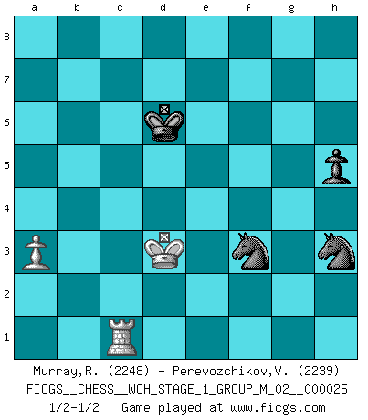 Last move : 1/2-1/2 2022 August 25 7:55:14 [Event "FICGS__CHESS__WCH_STAGE_1_GROUP_M_02__000025"] [Site "FICGS"] [Date "2022.03.14"] [Round "1"] [White "Murray,Russell"] [Black "Perevozchikov,Vjacheslav"] [Result "1/2-1/2"] [WhiteElo "2248"] [BlackElo "2239"] 1.e4 e6 2.d4 d5 3.exd5 exd5 4.Nf3 Nf6 5.Bd3 Bd6 6.Qe2+ Be6 7.c4 dxc4 8.Bxc4 Qe7 9.O-O O-O 10.Nc3 Re8 11.Bg5 Nbd7 12.Rfe1 Bxc4 13.Qxc4 Qf8 14.Qb3 Rxe1+ 15.Rxe1 b6 16.Bd2 Re8 17.Rd1 a5 18.Nb5 c6 19.Na7 c5 20.Nb5 cxd4 21.Nfxd4 Bc5 22.Bf4 h6 23.Kf1 Nh5 24.Bc7 Qe7 25.Qc2 g6 26.Nf3 Ndf6 27.Ne5 Rc8 28.Qc4 Ng7 29.Nxg6 Qe6 30.Ne5 Rxc7 31.Qxe6 Nxe6 32.Nxc7 Nxc7 33.g3 Kg7 34.Kg2 h5 35.a3 a4 36.Rd3 Nfd5 37.b3 Kf6 38.Nd7+ Ke6 39.Nxc5+ bxc5 40.bxa4 Ke5 41.a5 c4 42.Rd1 c3 43.Kf3 Na6 44.Ke2 Nc5 45.a6 Nxa6 46.Kd3 Ke6 47.Kd4 f5 48.h3 Nb8 49.f3 Nc6+ 50.Kc5 Ne5 51.Re1 c2 52.Kd4 Kd6 53.Rc1 Nxf3+ 54.Kd3 f4 55.gxf4 Nxf4+ 56.Kxc2 Nxh3 57.Kd3 1/2-1/2 French : Exchange variation Kingside Castling by player White (move 9) Kingside Castling by player Black (move 9) 10 pieces endgame at move 55 : White KRPPP , Black KNNPP WHITE : King + 1 Rook 3 Pawns BLACK : King + 2 Knights 2 Pawns 9 pieces endgame at move 55 : White KRPP , Black KNNPP WHITE : King + 1 Rook 2 Pawns BLACK : King + 2 Knights 2 Pawns 8 pieces endgame at move 56 : White KRPP , Black KNNP WHITE : King + 1 Rook 2 Pawns BLACK : King + 2 Knights 1 Pawn 7 pieces endgame at move 56 : White KRP , Black KNNP WHITE : King + 1 Rook 1 Pawn BLACK : King + 2 Knights 1 Pawn This chess game ended in a draw. Follow this game move after move (download)Only sissies Castle. (Rob Sillars) Die Neutralität betrachte ich als eine schwere Krankheit. (Viktor Kortschnoi) Aquel que teme a un Peón de Reina aislado, debería de retirarse del Ajedrez. (Siegbert Tarrasch) Des combinaisons [dans le jeu d'échecs] pareilles à des mélodies. Je crois entendre pour ainsi dire la musique des coups... (Vladimir Nabokov) Lottery : A tax on people who are bad at math. (Author unknown)