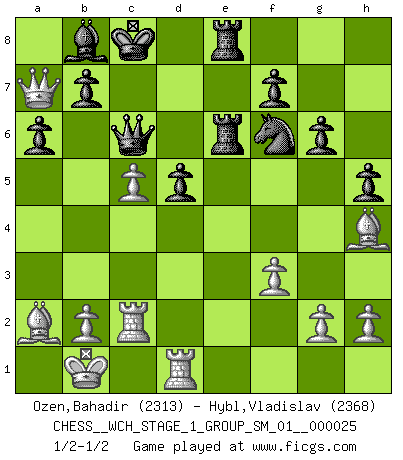 Last move : 1/2-1/2 2022 June 10 7:23:15 [Event "FICGS__CHESS__WCH_STAGE_1_GROUP_SM_01__000025"] [Site "FICGS"] [Date "2022.03.14"] [Round "1"] [White "Ozen,Bahadir"] [Black "Hybl,Vladislav"] [Result "1/2-1/2"] [WhiteElo "2313"] [BlackElo "2368"] 1.e4 c5 2.Nf3 d6 3.d4 cxd4 4.Nxd4 Nf6 5.Nc3 a6 6.f3 e5 7.Nb3 Be6 8.Be3 h5 9.Qd2 Nbd7 10.Nd5 Bxd5 11.exd5 g6 12.O-O-O Nb6 13.Kb1 Nbxd5 14.Bg5 Be7 15.Bd3 Qc7 16.Rhe1 Nb6 17.a4 O-O-O 18.a5 Nbd7 19.Be3 Kb8 20.Bg1 d5 21.c3 Bd6 22.Qf2 Qc6 23.Rc1 Rhe8 24.Qa7+ Kc8 25.Red1 Re6 26.Nd4 exd4 27.cxd4 Nc5 28.dxc5 Bf4 29.Rc2 Bc7 30.Bf2 Bxa5 31.Bh4 Rde8 32.Bc4 Bc7 33.Ba2 Bb8 1/2-1/2 Sicilian : Najdorf Queenside Castling by player White (move 12) Queenside Castling by player Black (move 17) This chess game ended in a draw. Follow this game move after move (download)Botvinnik tried to take the mystery out of Chess, always relating it to situations in ordinary life. He used to call Chess a typical inexact problem similar to those which people are always having to solve in everyday life. (Garry Kasparov) Über Kasparov: Es ist offensichtlich, daß er in einem totalitären Staat aufwuchs und deshalb zu diktatorischen Zügen neigt. (Viktor Kortschnoi) ¿Porque tengo que perder ante este idiota?. (Aron Nimzovich) Assurément je connaissais par expérience le mystérieux attrait de ce jeu royal, le seul entre tous les jeux inventés par les hommes qui échappe souverainement à la tyrannie du hasard, le seul où l'on ne doive sa victoire qu'à son intelligence ou plutôt à une certaine forme d'intelligence. Mais n'est-ce pas déjà le limiter injurieusement que d'appeler les échecs un jeu ? N'est-ce pas une science, un art ou quelque chose qui, comme le cercueil de Mahomet entre ciel et terre, est suspendu entre l'un et l'autre, et qui réunit un nombre incroyable de contraires ? [...] C'est une pensée qui ne mène à rien, une mathématique qui n'établit rien, un art qui ne laisse pas d'uvre, une architecture sans matière; et il l'a prouvé néanmoins qu'il était plus durable, à sa manière, que les livres ou que tout autre monument, ce jeu unique qui appartient à tous les peuples et à tous les temps, et dont personne ne sait quel dieu en fit don à la terre pour tuer l'ennui, pour aiguiser l'esprit et stimuler l'âme. Où commence-t-il, où finit-il ? (Stefan Zweig) That's absurd. I love it. (Gregory House, House M.D.)