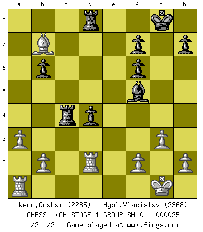 Last move : 1/2-1/2 2022 June 11 17:52:13 [Event "FICGS__CHESS__WCH_STAGE_1_GROUP_SM_01__000025"] [Site "FICGS"] [Date "2022.03.14"] [Round "1"] [White "Kerr,Graham"] [Black "Hybl,Vladislav"] [Result "1/2-1/2"] [WhiteElo "2285"] [BlackElo "2368"] 1.Nf3 d5 2.g3 c5 3.Bg2 Nf6 4.d4 cxd4 5.O-O e6 6.Nxd4 e5 7.Nf3 Nc6 8.c4 d4 9.e3 Be7 10.exd4 exd4 11.Bf4 O-O 12.Ne5 Qb6 13.Re1 Nxe5 14.Bxe5 Rd8 15.Nd2 Be6 16.Qb3 Bb4 17.Bxf6 gxf6 18.Red1 Rac8 19.a3 Bxd2 20.Qxb6 axb6 21.Rxd2 Rxc4 22.Bxb7 Bf5 1/2-1/2 Reti : King's Indian attack Kingside Castling by player White (move 5) Kingside Castling by player Black (move 11) This chess game ended in a draw. Follow this game move after move (download)Chess problems demand from the composer the same virtues that characterize all worthwhile art: originality, invention, conciseness, harmony, complexity, and splendid insincerity. (Vladimir Nabokov) Wenn Du nicht kämpfst, um anderen etwas zu beweisen, sondern nur für Dich selbst, dann bist du fast unbesiegbar. (Garry Kasparov) El Ajedrez es una manera fabulosa para que los niños aprendan a autovalorarse y a autoestimarse. (Saudin Robovic) Les Echecs ont trois composantes : le temps, l'espace et le matériel en dernier. (Mikhail Tal) For a mechanic, you seem to do an excessive amount of thinking. (C-3PO in Star Wars ep.2)